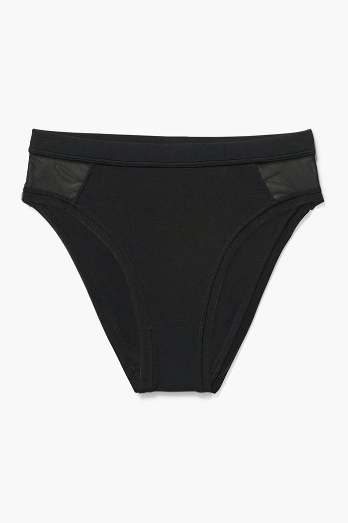 Richer Poorer high cut brief underwear in black. Minimal coverage, high waist, covered elastic waistband, power mech insets at sides, and high cut leg openings.Â