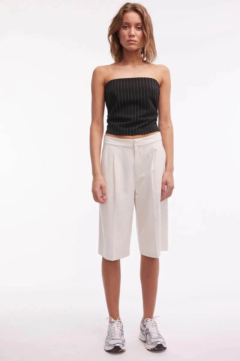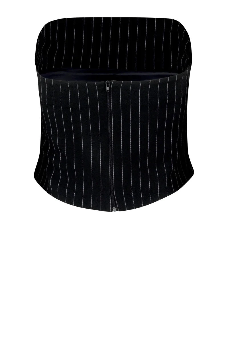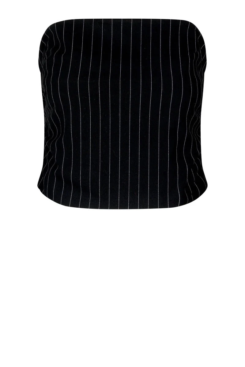 Oval Square Independent tube top in black with sand stripe suiting material. Gathered detail at side seam, zip back.