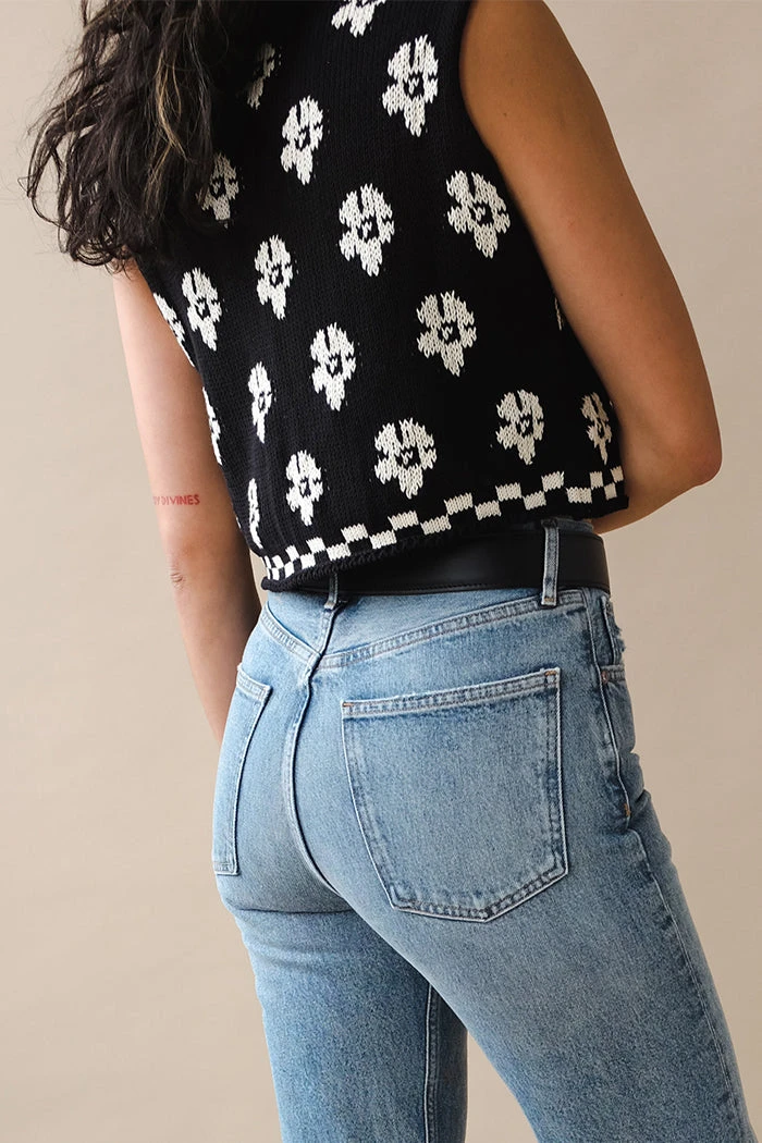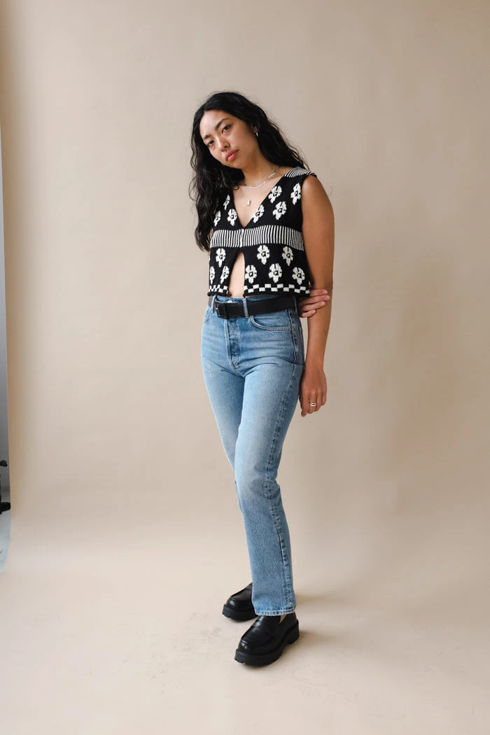 Tach Loreza knit tank top in black and white jaquard floral.Â