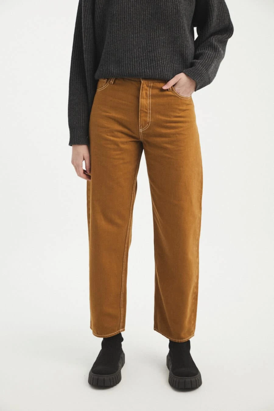 Rita Row Ludwig high waisted jeans with contrast stitching in mustard brown.Â