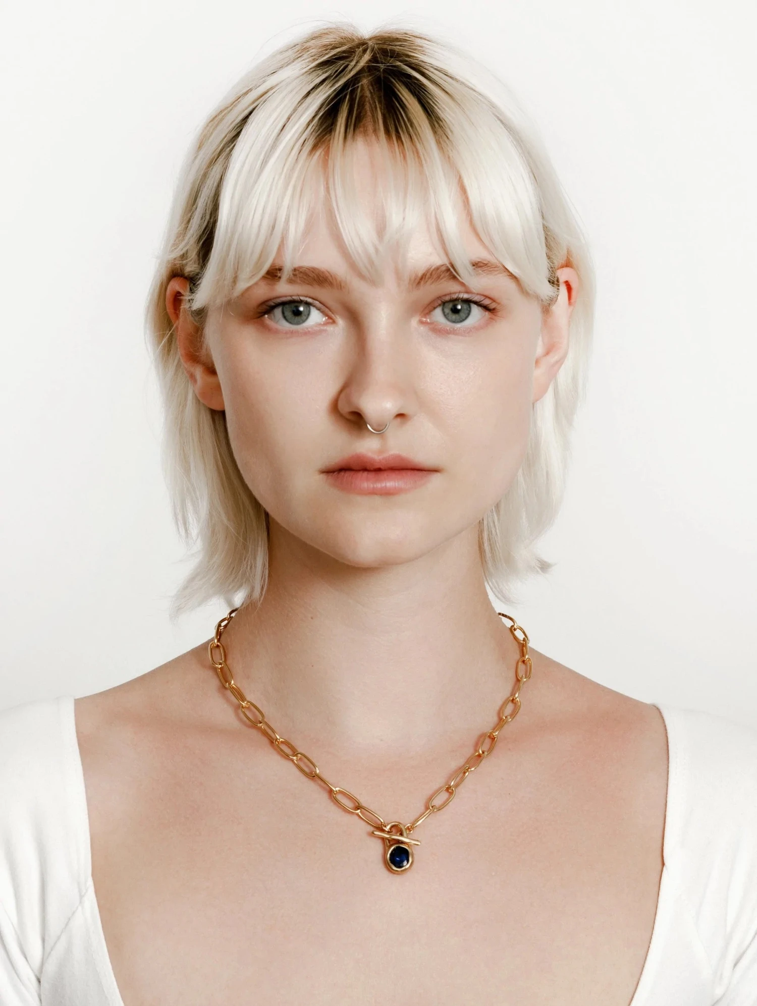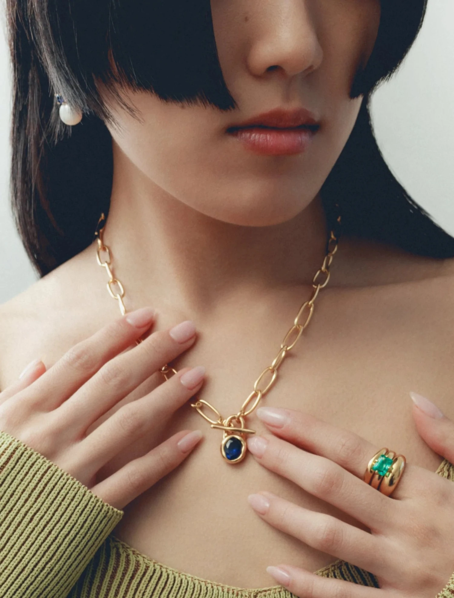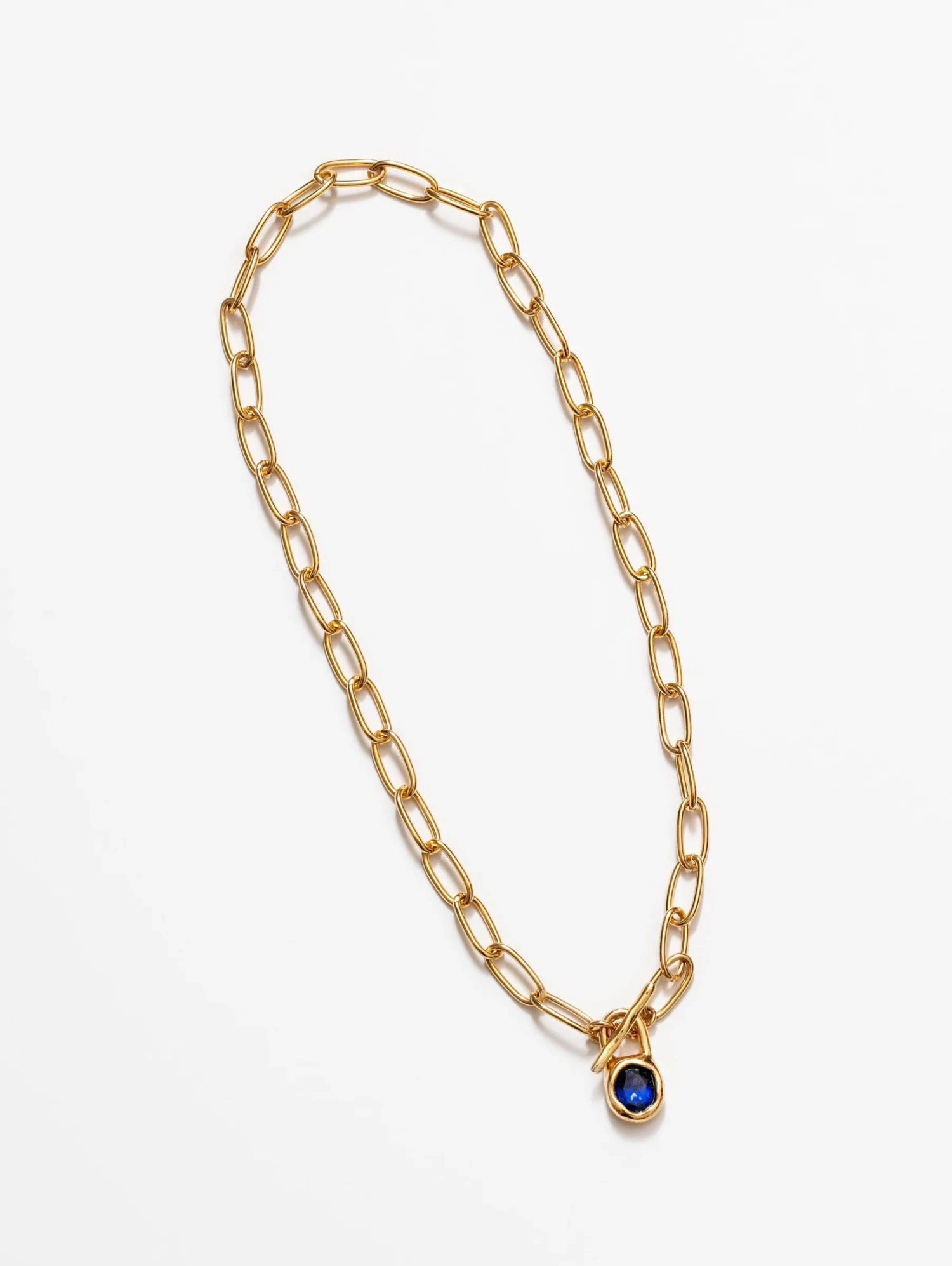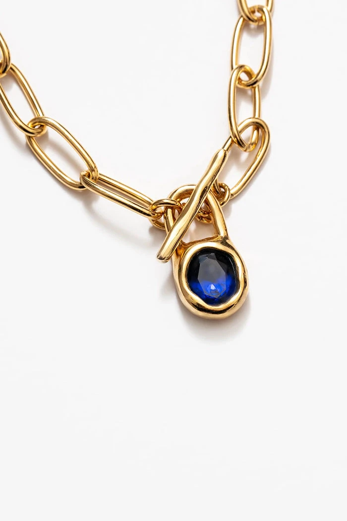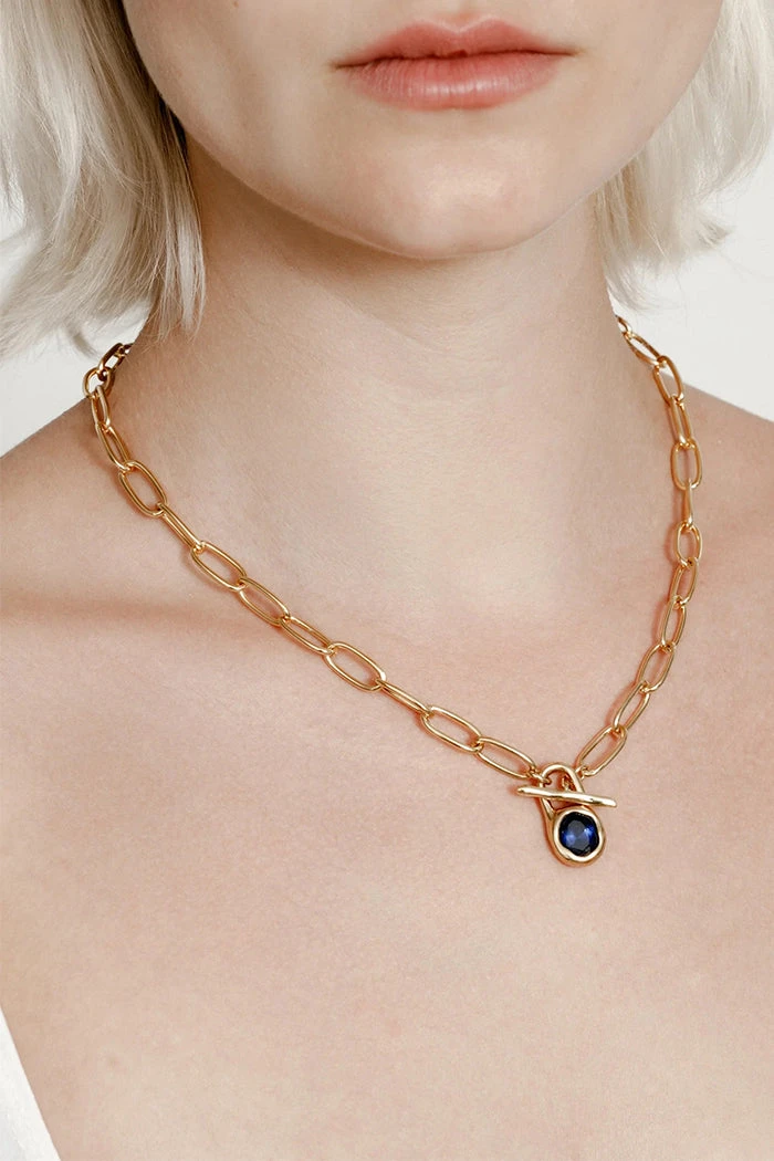 Wolf Circus Margot necklace gold oval cable link with blue sapphire stone toggle.