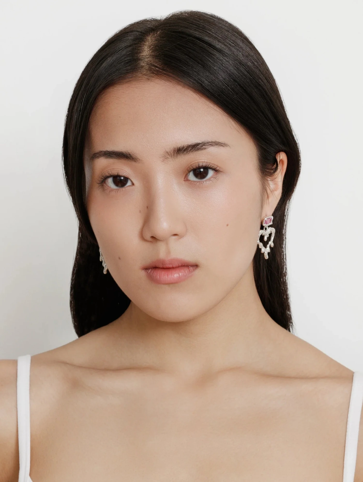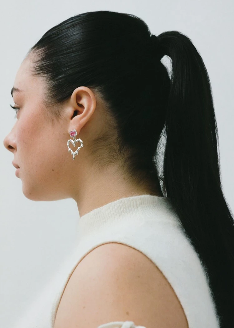 Wolf drippy heart Circus Martina earrings in sterling silver with pink sapphire gemstone.