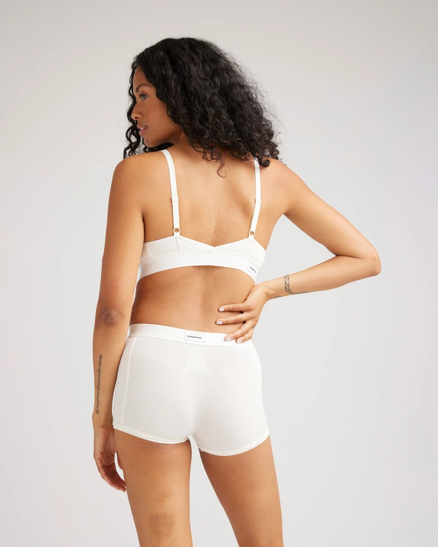 Richer Poorer modal rib boxer brief in bone. Mid rise with 2″ inseam. Soft elastic waistband, faux snap detail at front, ultra-soft modal cotton blend, shrink resistant.