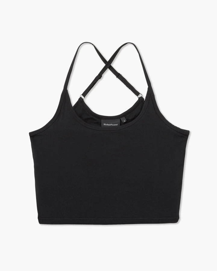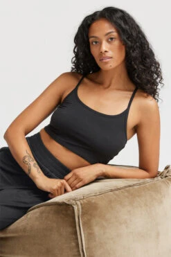 Richer Poorer night knit bra top in black. Slim fit, built-in shelf bra, adjustable criss cross shoulder straps, and scoop neckline.