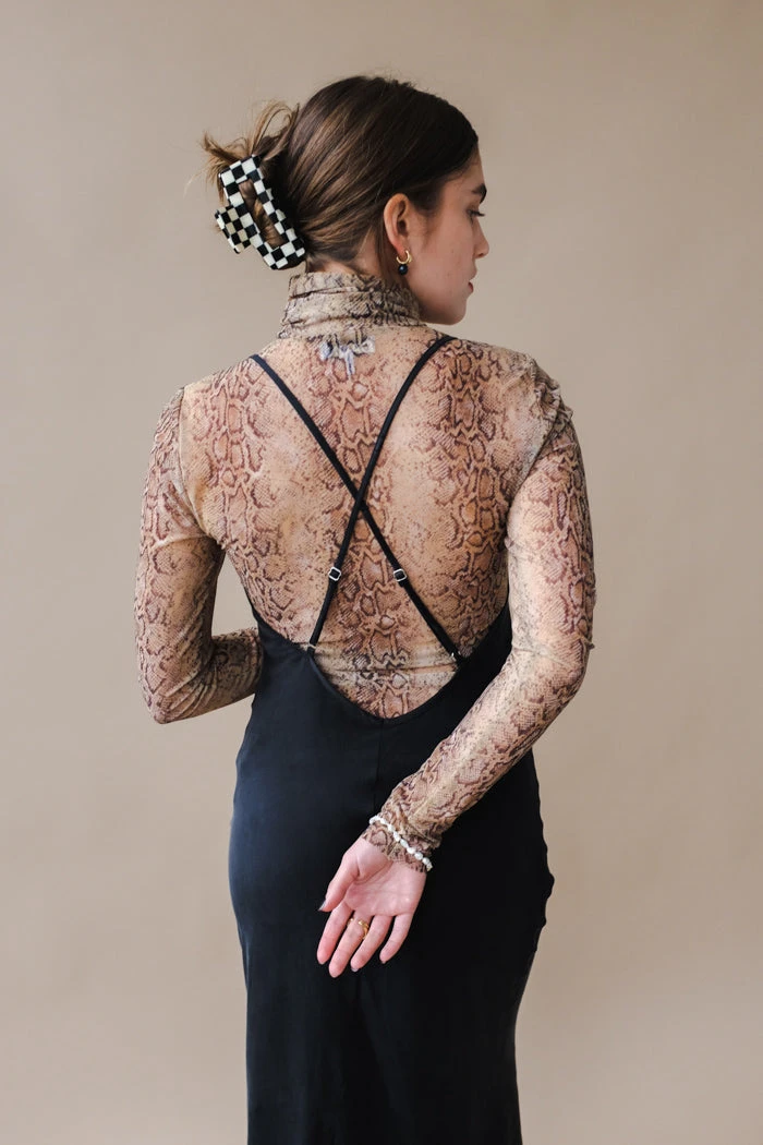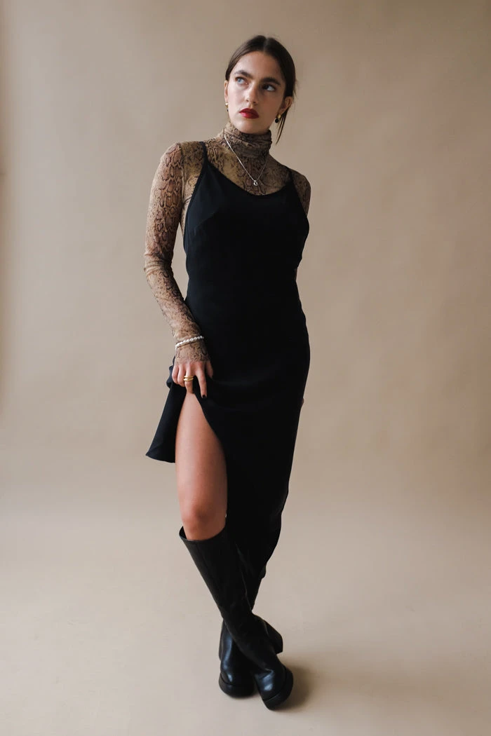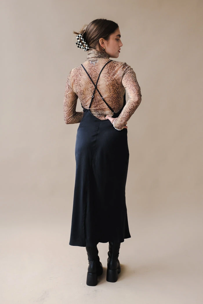 Oh Seven Days Phoebe silky slip dress in black. Low back with criss cross adjustable straps. Matte silk finish light fabric.Â