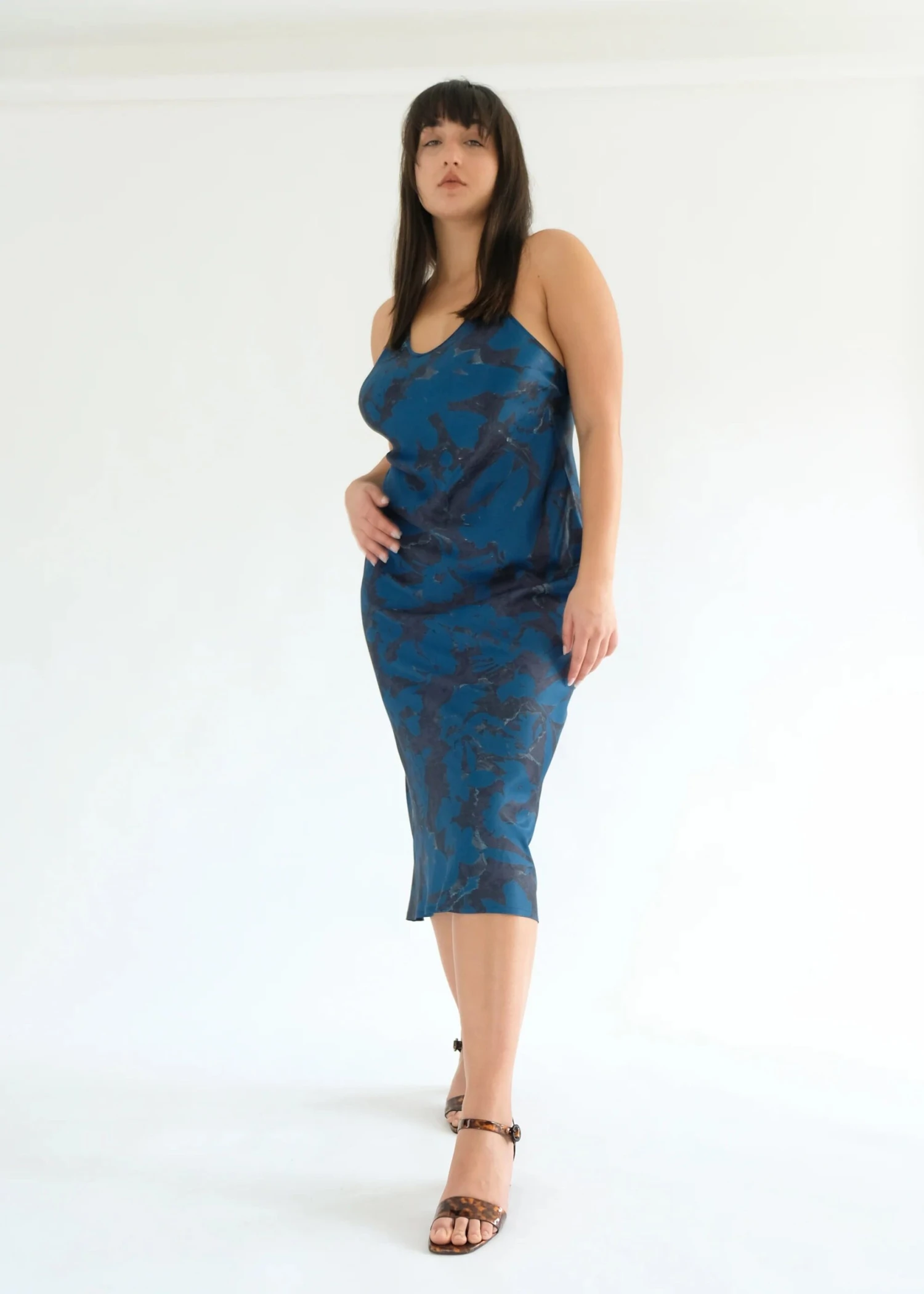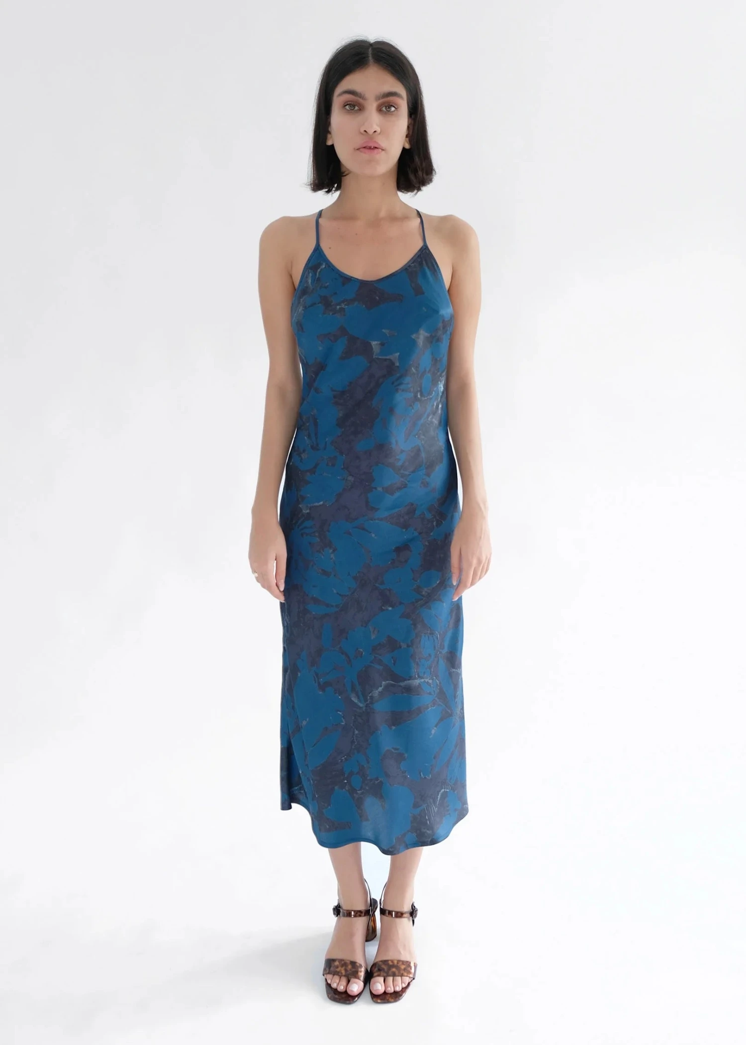 Oh Seven Days Phoebe silky slip dress in abstract blue floral print. Low back with criss cross adjustable straps. Matte silk finish light fabric.Â