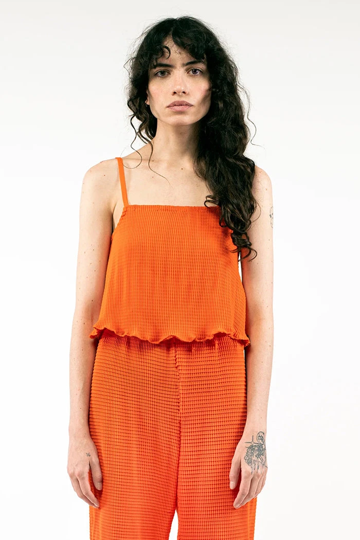 Nin Pleat strap singlet tank top in orange. A cropped singlet featuring thin spaghetti straps, pleated with rectangle small pleats. The singlet is paired with an interior mesh lining to respect the form of the pleat; the lining adds extra support to the bust area and creates comfort for the wearer. Pair with simple pleat pant for a matching set.