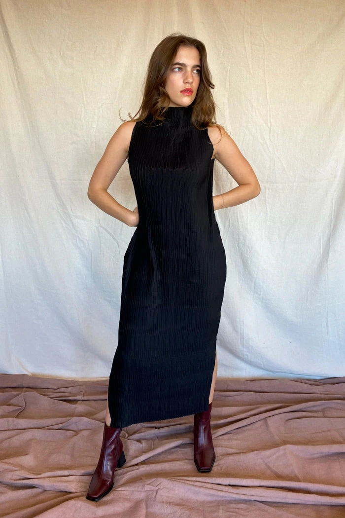 Nin Studio Wave mock neck pleated dress in opaque black. Side slit at knee.Â