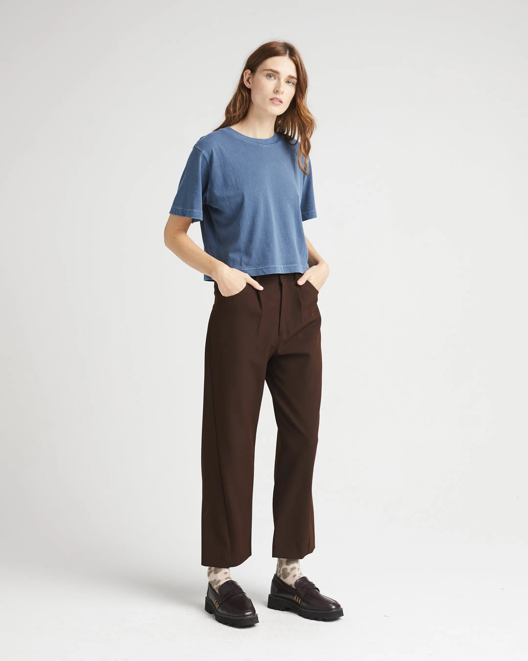 Richer Poorer moonlit ocean blue relaxed short sleeve crop tee in amazing semi thick cotton. Pigment dyed, dropped shoulder seams. Oversized neck rib.