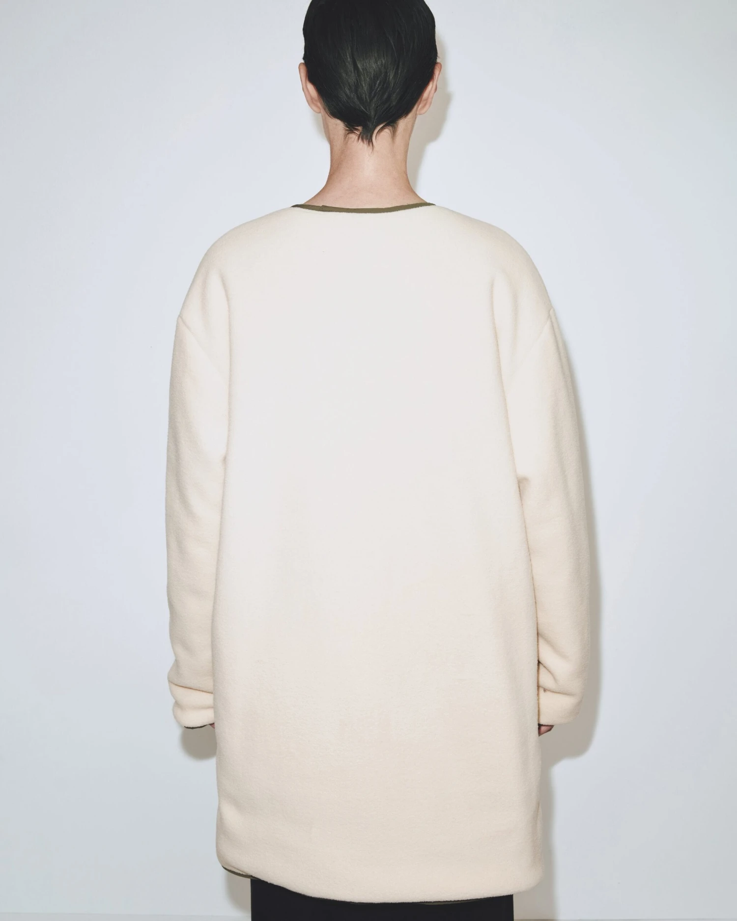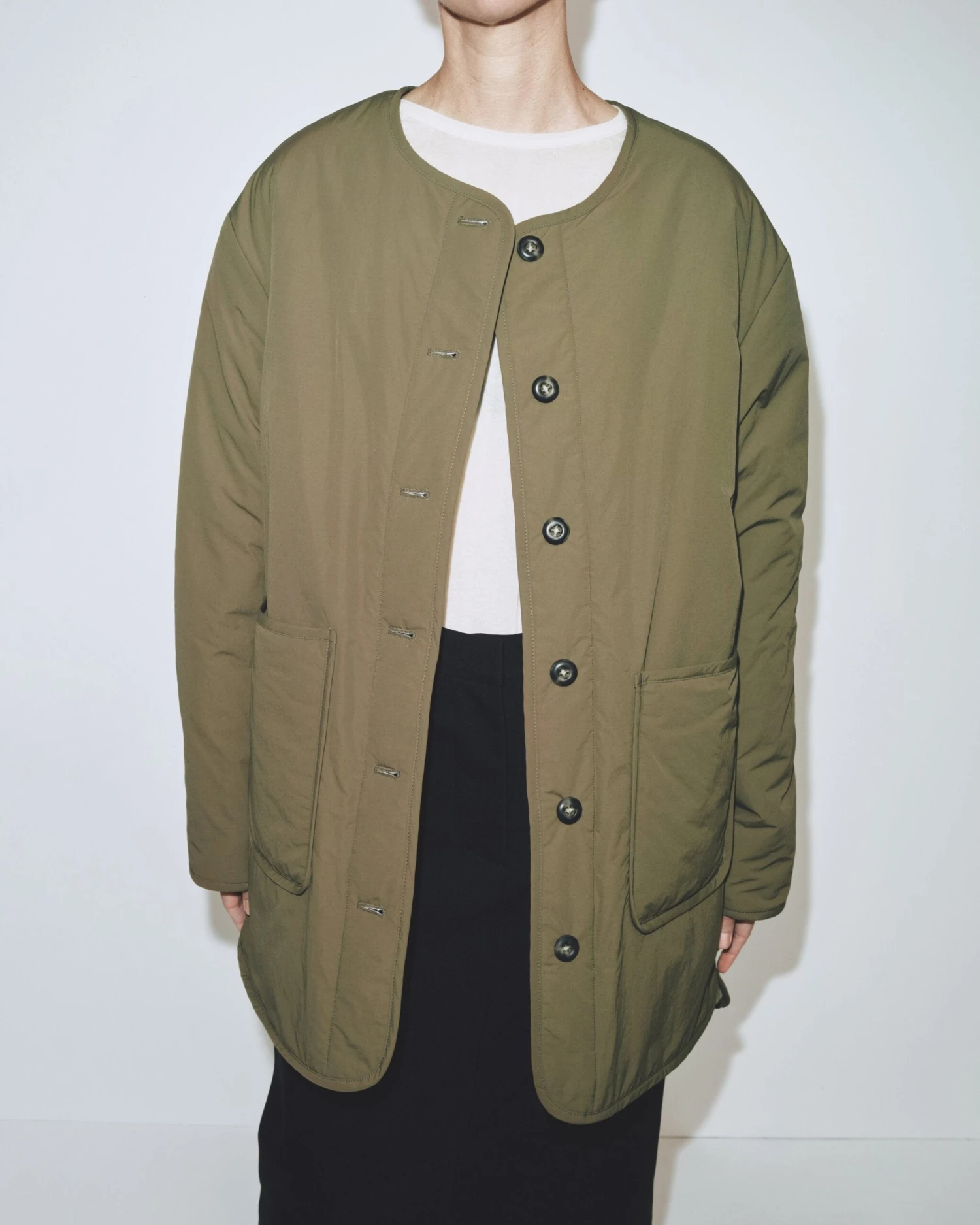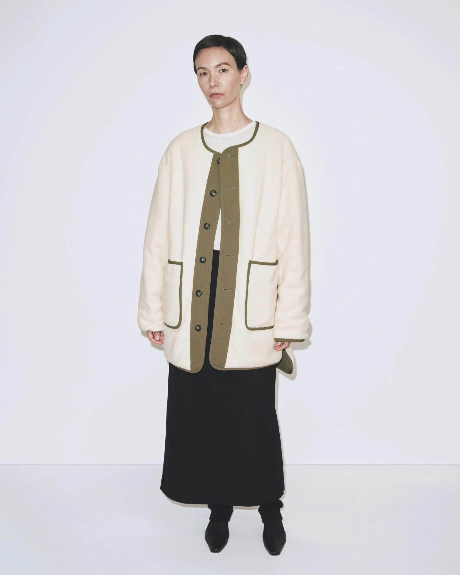 Mijeong Park reversible padded mid-weight insulated jacket in olive green with a fleece lining. Oversized, relaxed fit, dropped shoulder, and button closure.