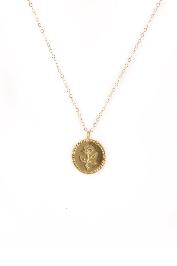 Wolf Circus engraved Rose Coin necklace 14k gold.