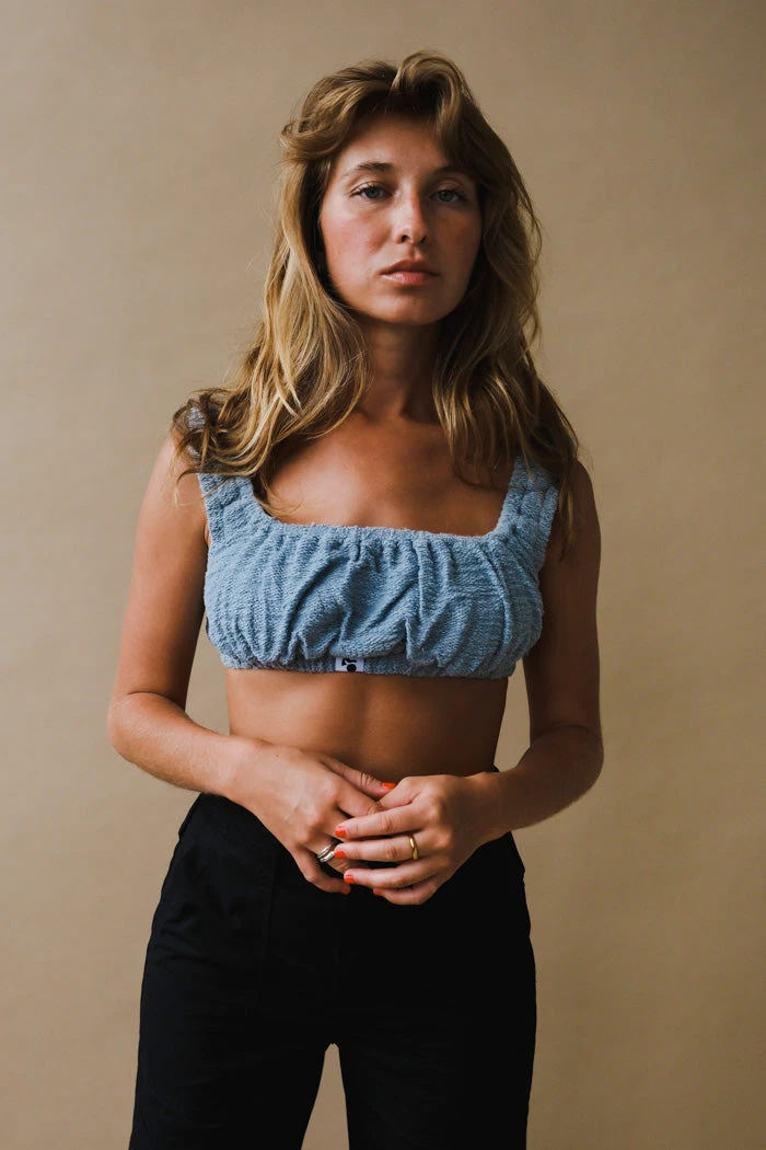 Oh Seven Days Ruby crop top in blue. Made from surplus cotton elastane blend, this top features a gathered elasticated crop top both with a 2cm elasticated waistband.