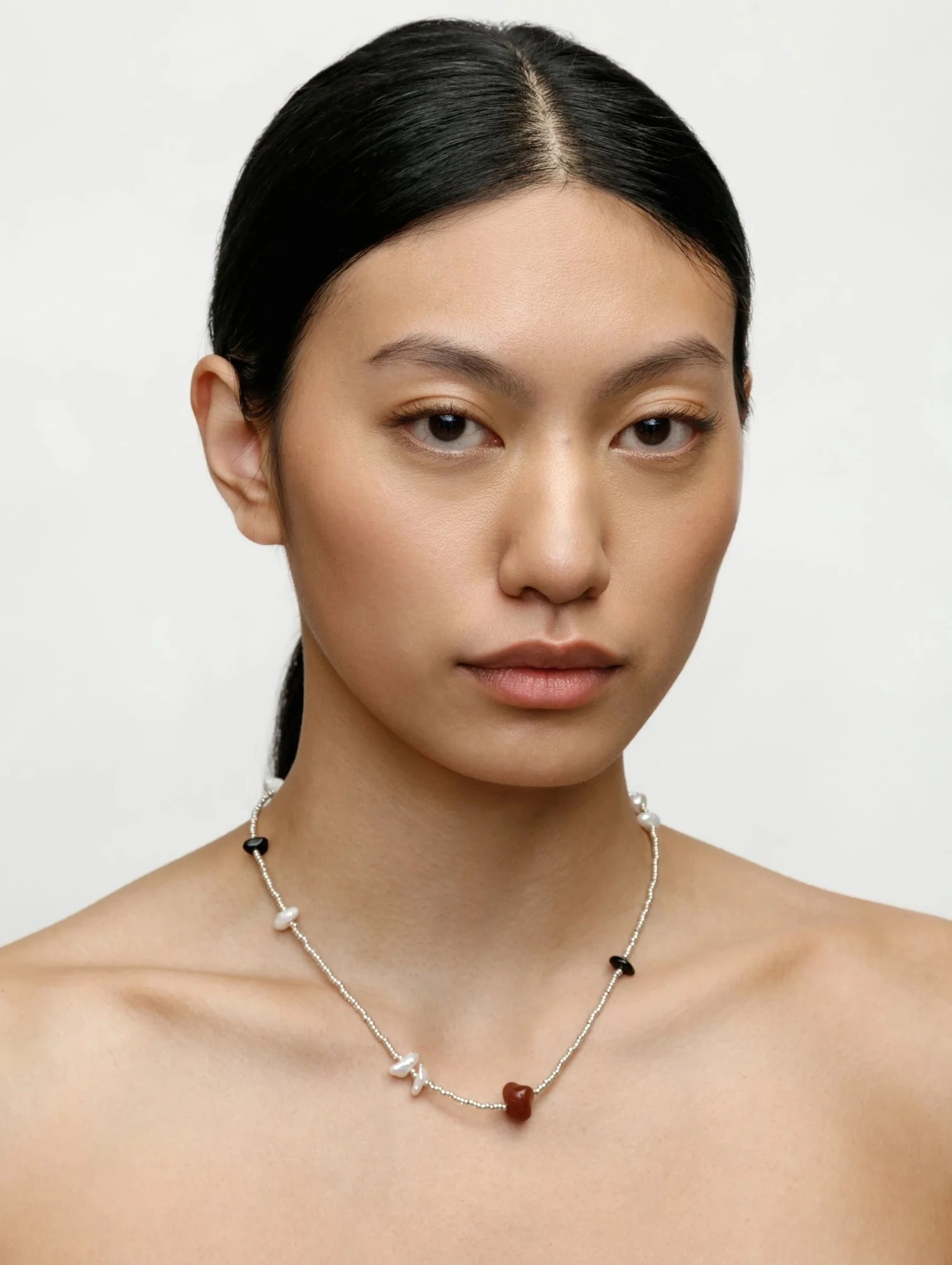 17″ seed bead necklace featuring natural stones and freshwater pearls, 925 sterling silver clasp.