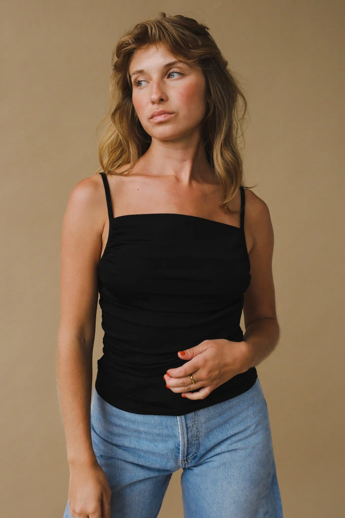 Rita Row black ruched tank top in super soft silky ribbed fabric.