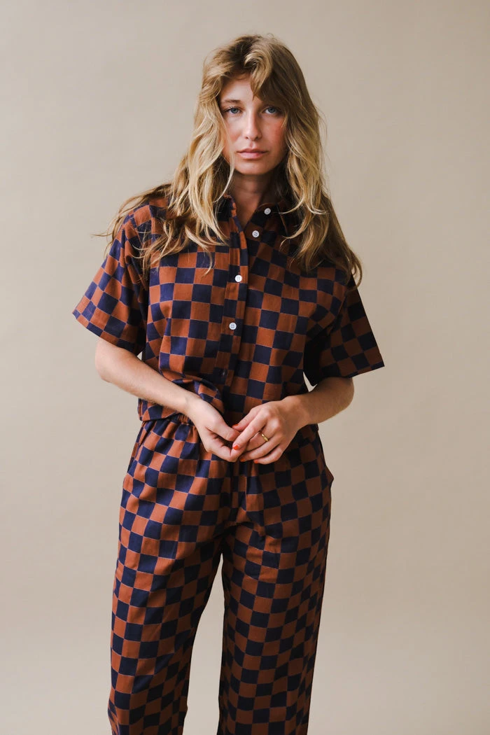 Dushyant short sleeve boxy button up in hand printed chocolate chessboard print. Pair with matching pant.Â