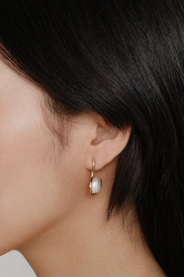 14k gold vermeil wavy wire studs featuring freshwater pearl, 14k gold vermeil posts.