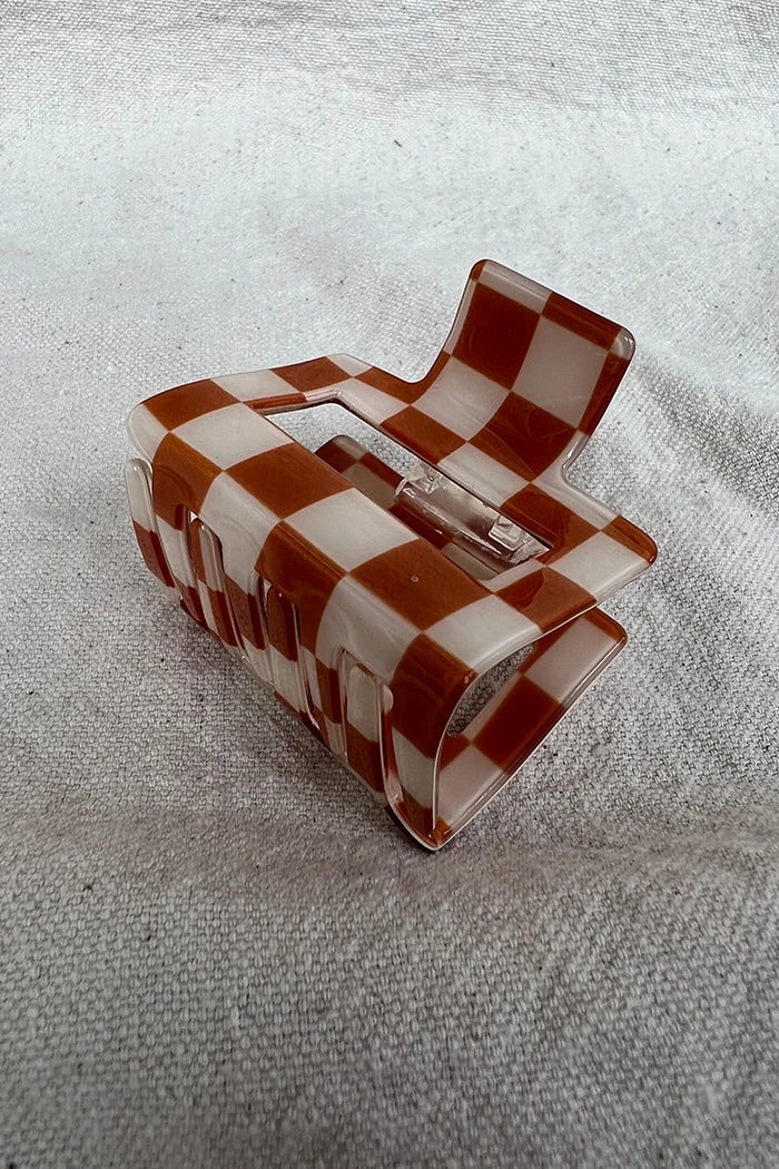 Small square hair claw in congac brown and cream checker.