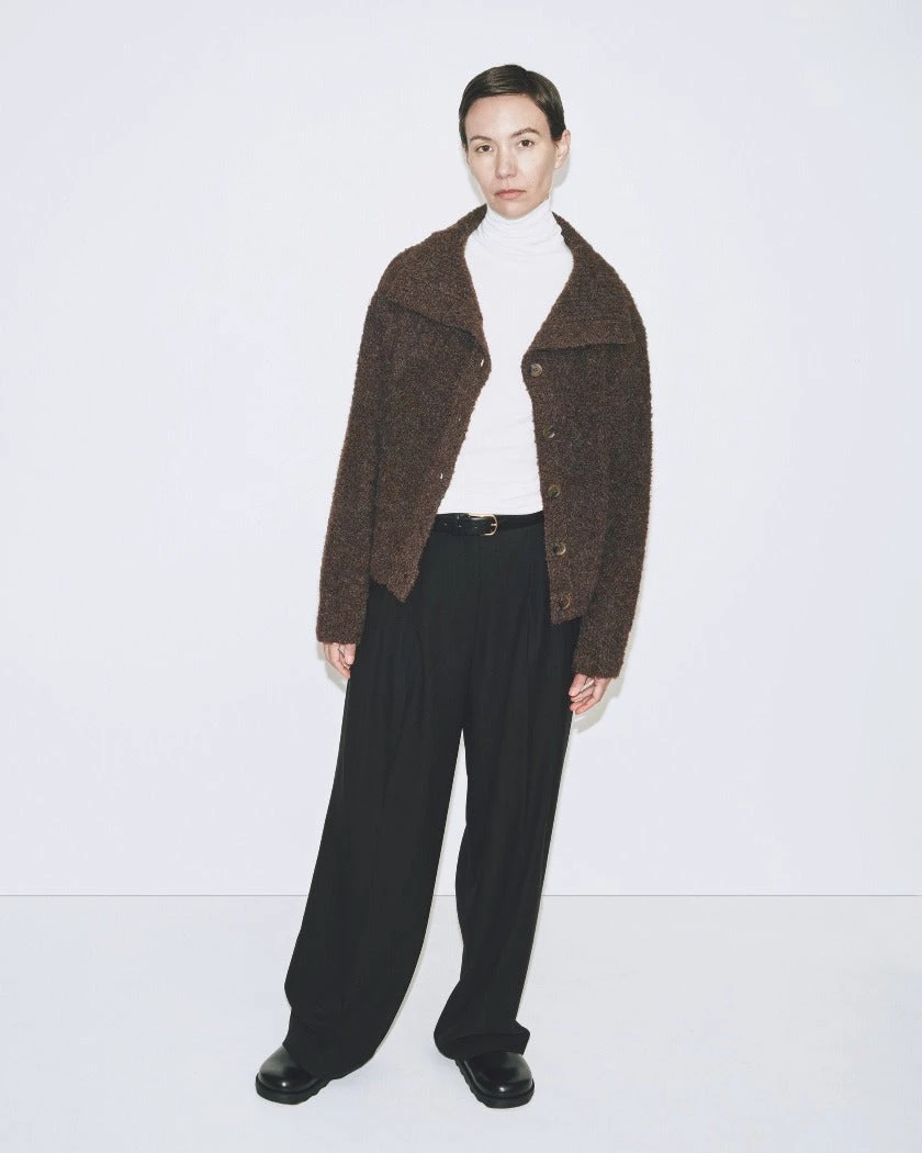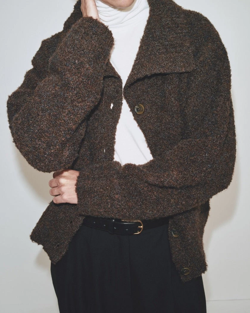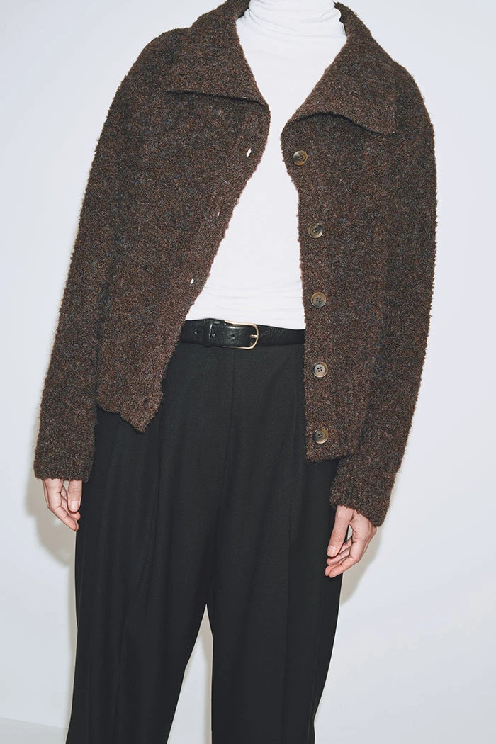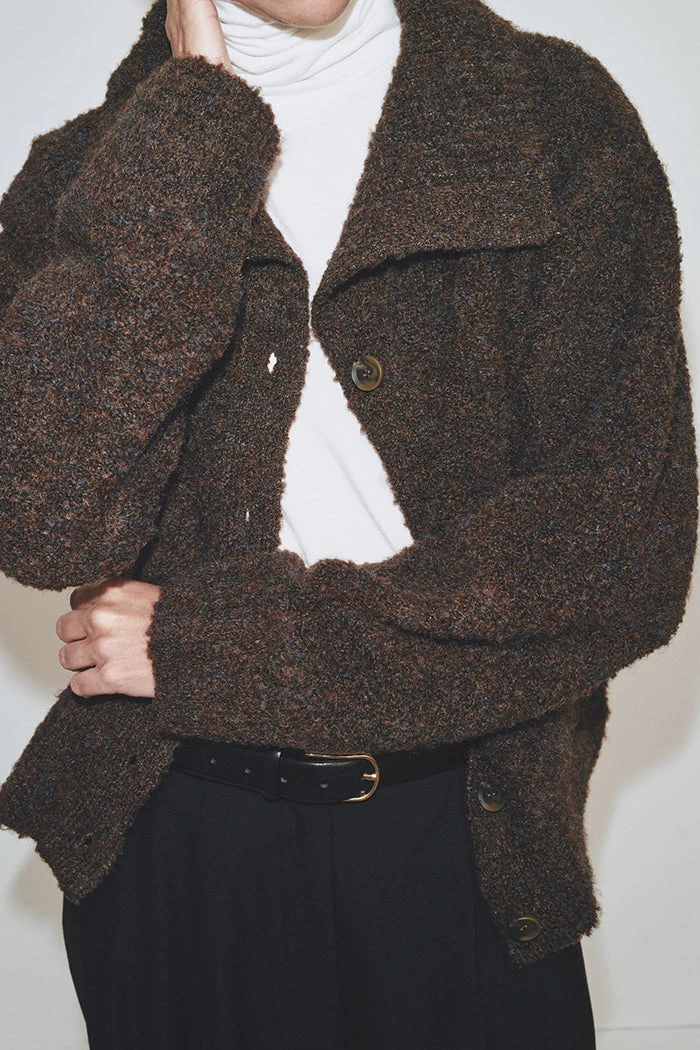 Mijeong Park spread collar boucle cardigan in brown knit. Button closures.