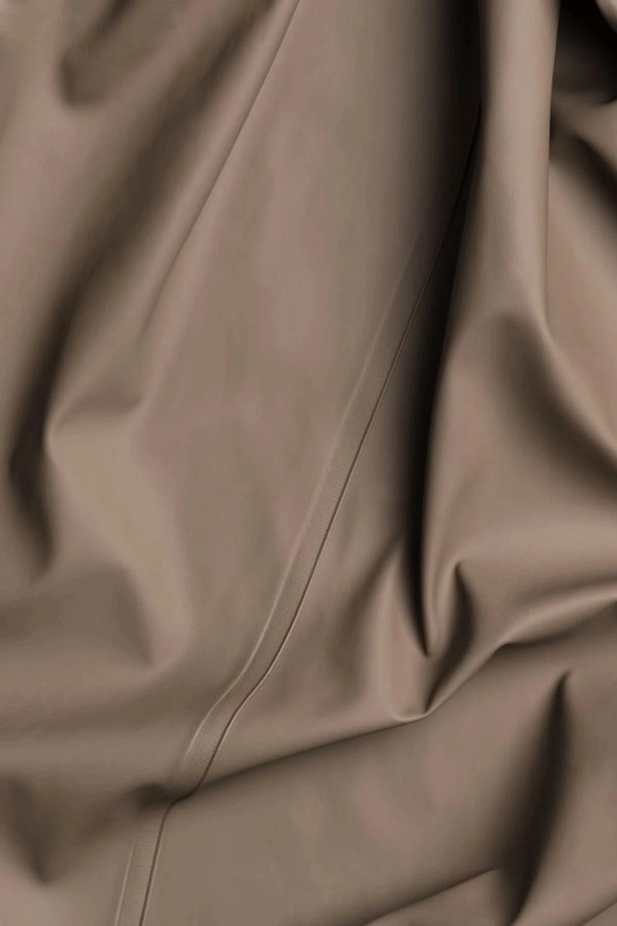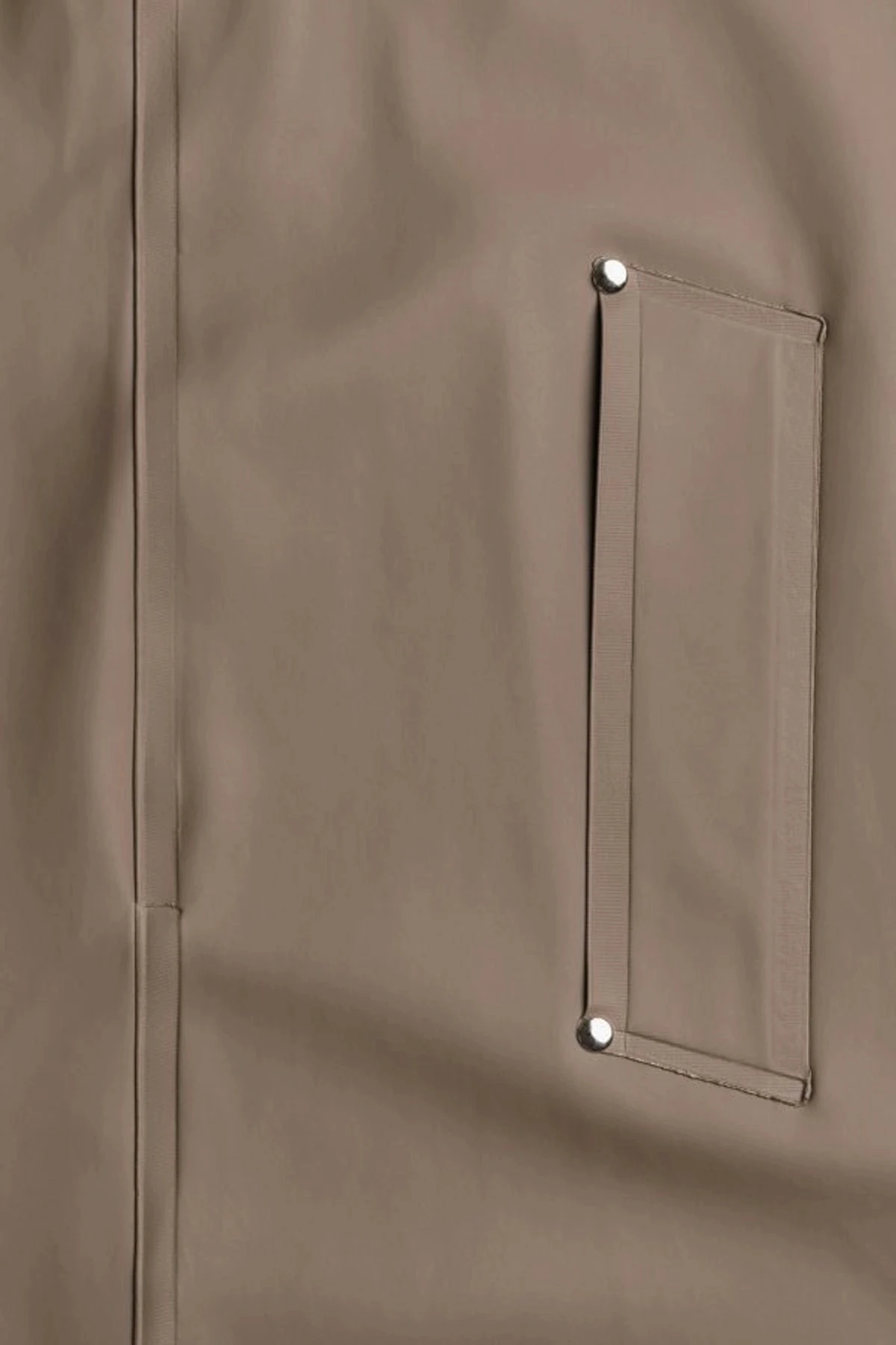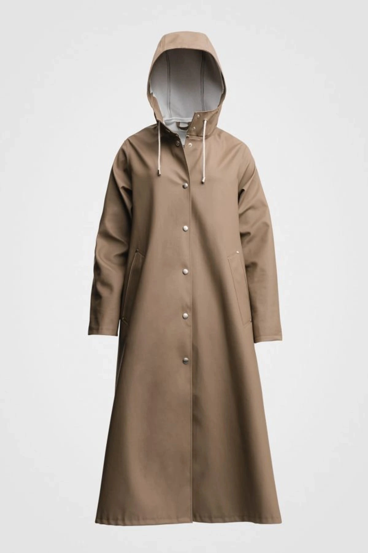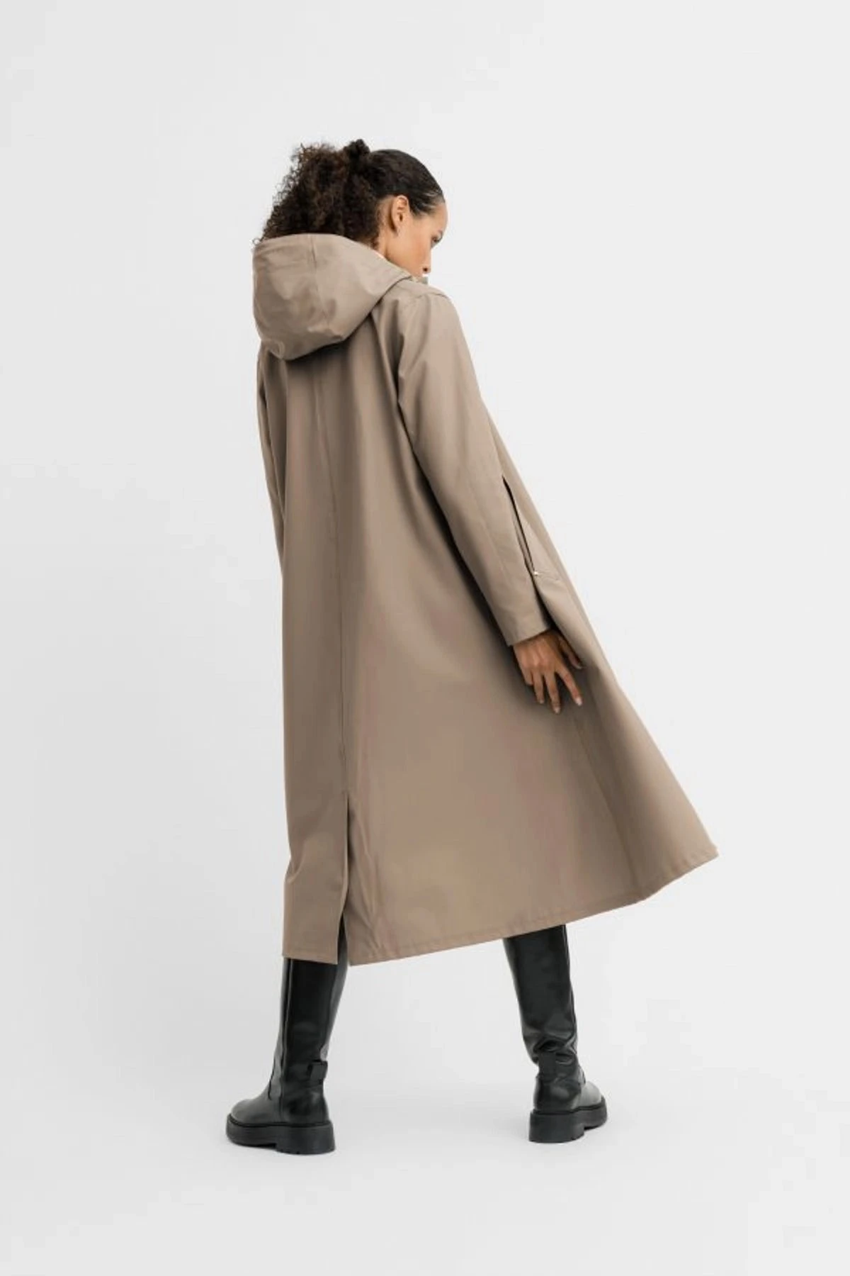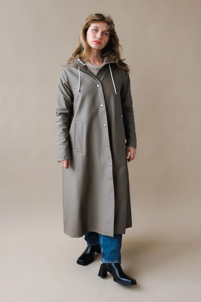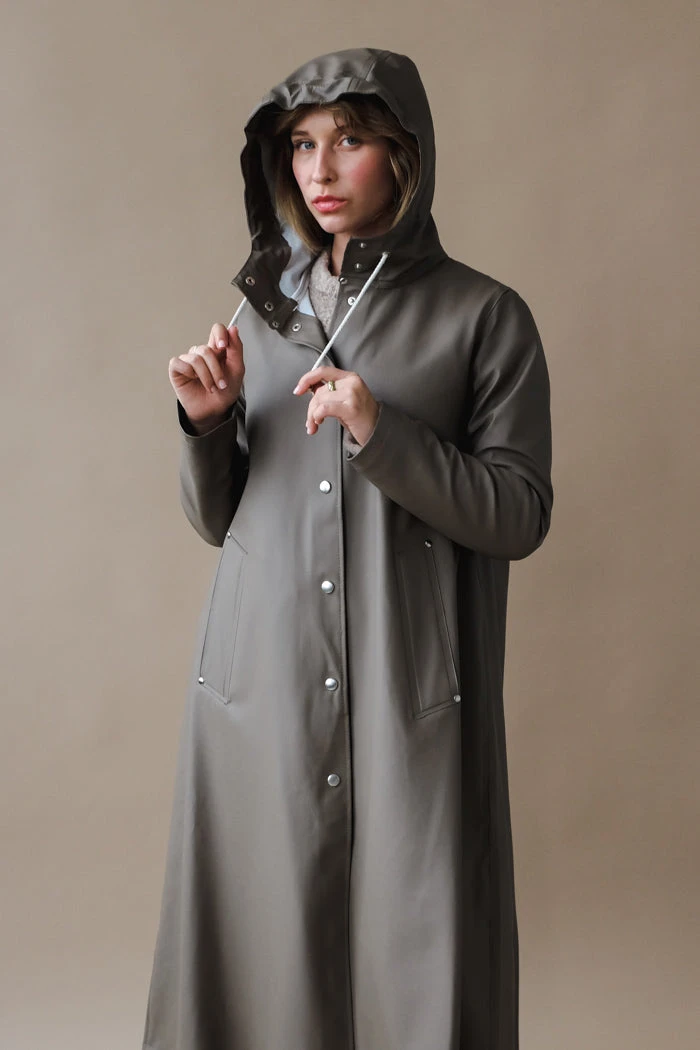 Stutterheim Mosebacke long raincoat in brown mole is the a flowing A-line women’s raincoat combining flair with all-weather protection in long cut. Mosebacke is the ladies’ specific complement to the unisex Stockholm raincoat. It combines the best of Stutterheim’s Scandinavian design sensibilities and wet-weather protection with a flowing, feminine silhouette. It is handmade in rubberized cotton, comes unlined and with welded seams. The finest craftsmanship is used to create this beautiful raincoat, here in aloe with silver buttons, white cotton lining and hemp strings. See other colors in the Mosebacke here. Check out the straight Stockholm style here. Mosebacke