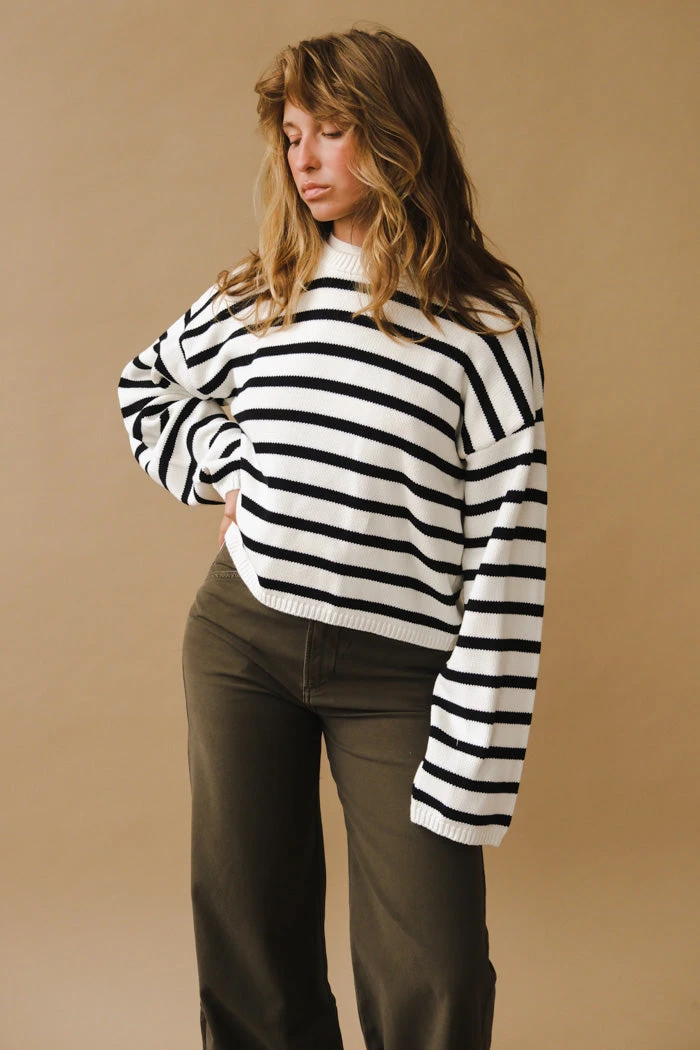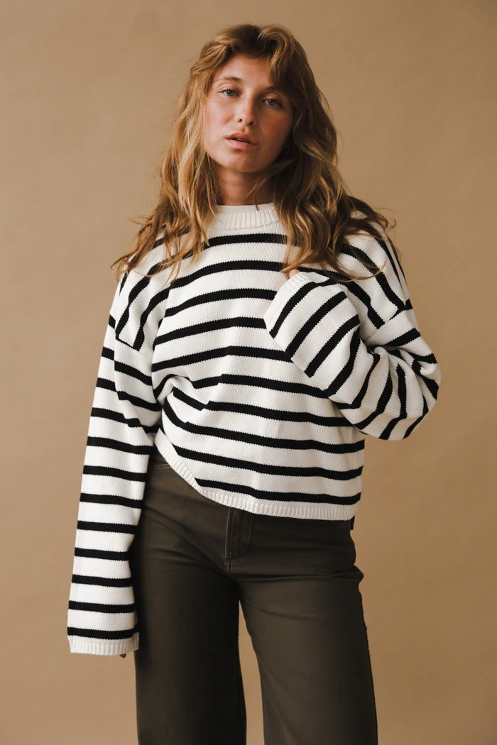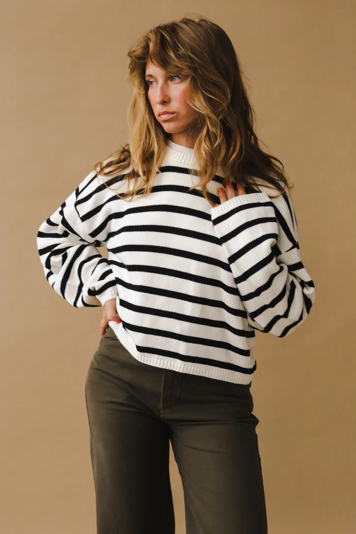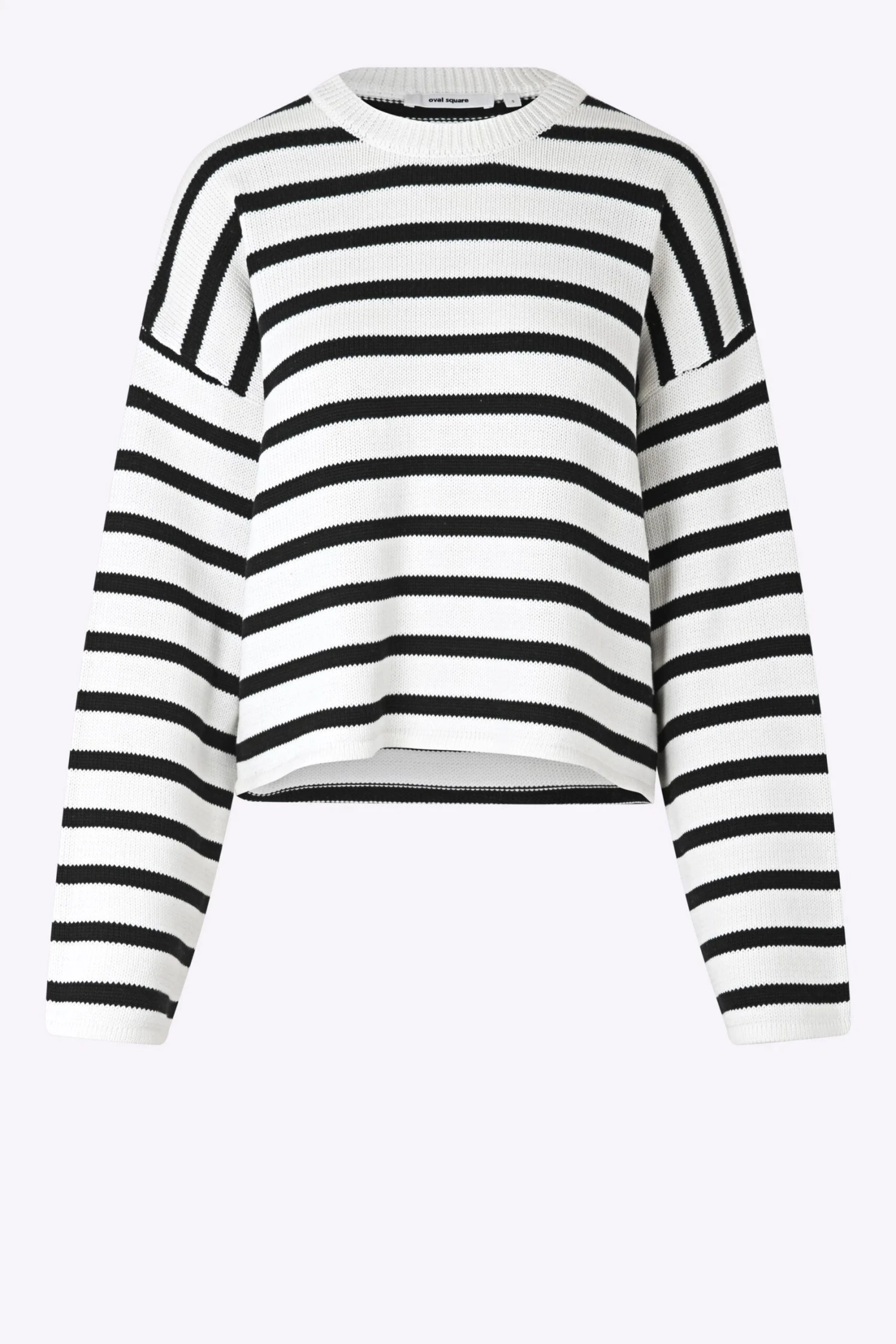 Oval Square swatch knit stripe crew neck pullover sweater. Made in soft organic cotton with all-over stripes. Featuring a round ribbed neck and dropped shoulders with long sleeves. Wide, boxy fit.
