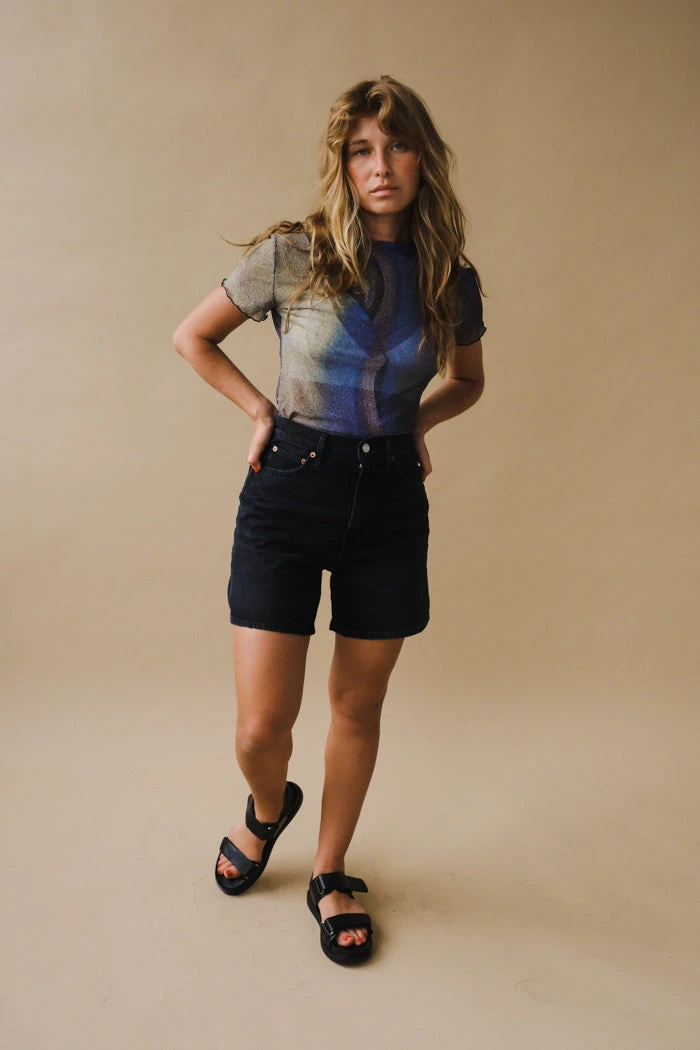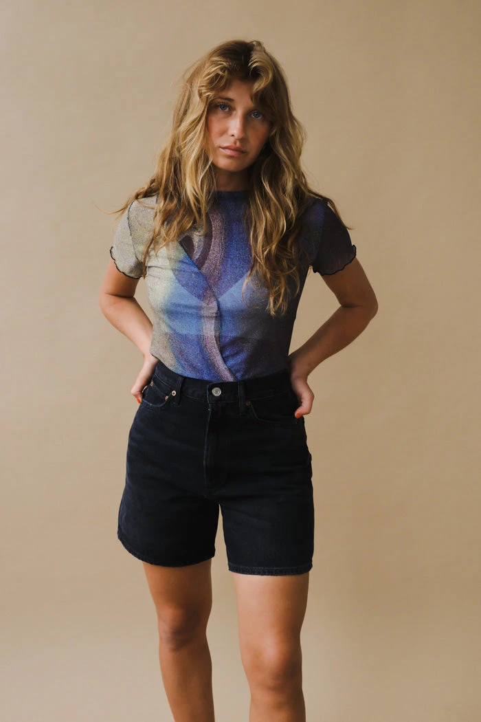 Nin Studio Swirl mesh short sleeve tee in depth pattern. Inspired by the unconscious and conscious in constant communication, The Swirl Top is a hypnotic mix between mesh fabrics.