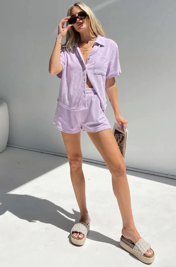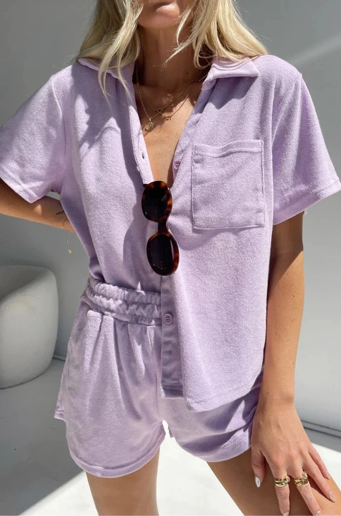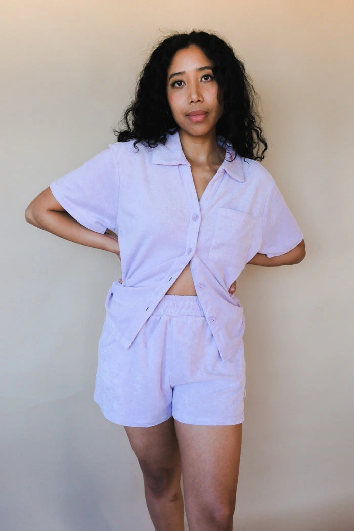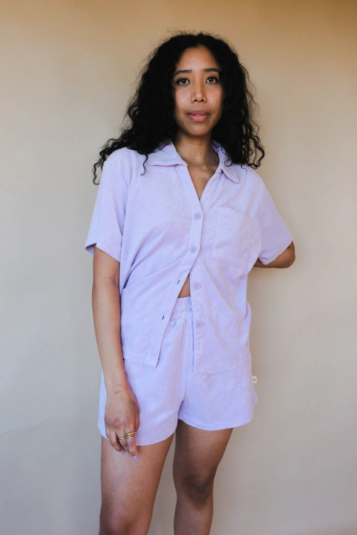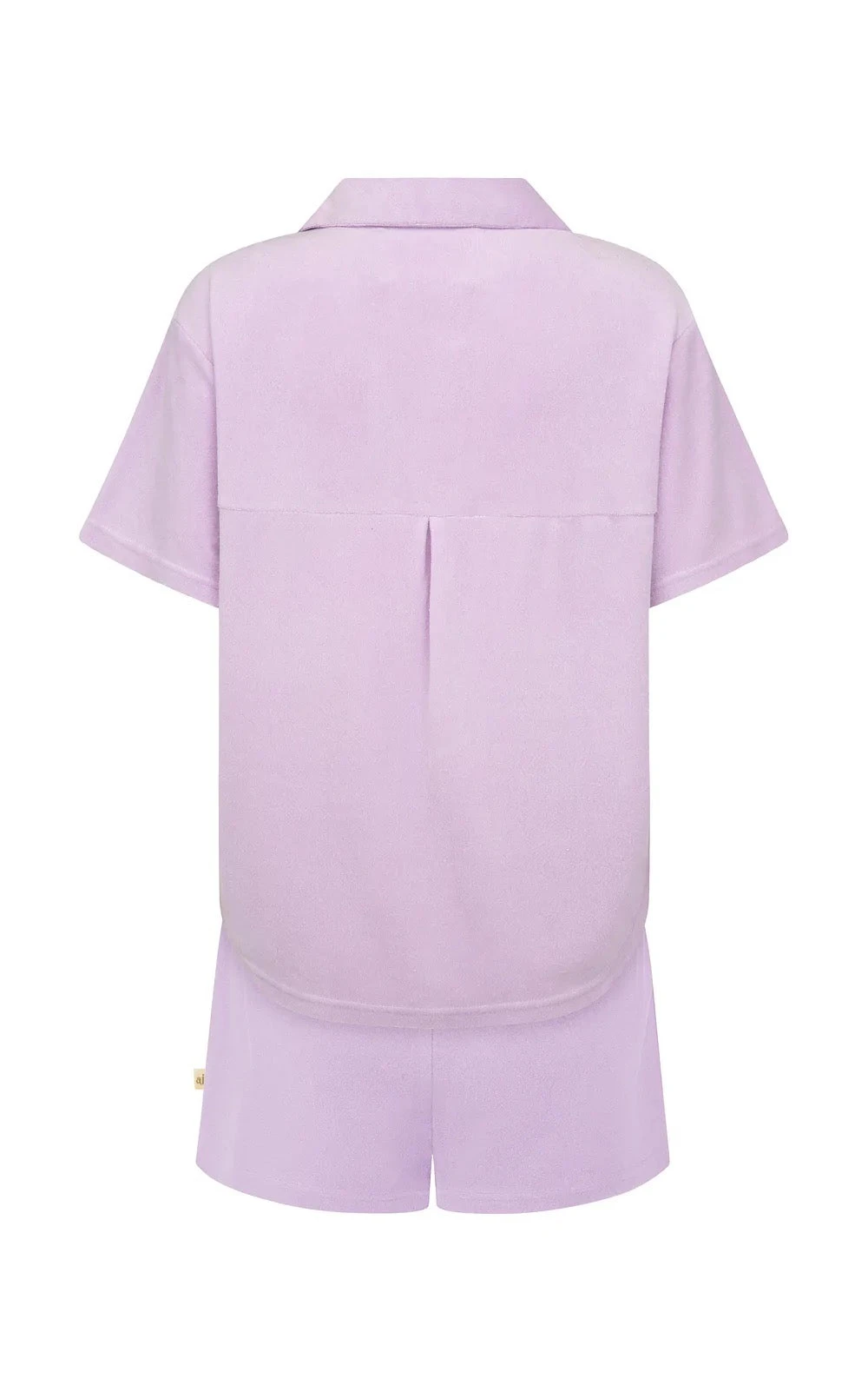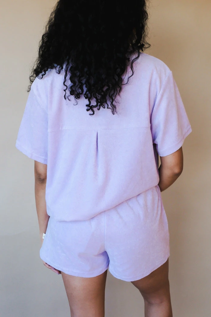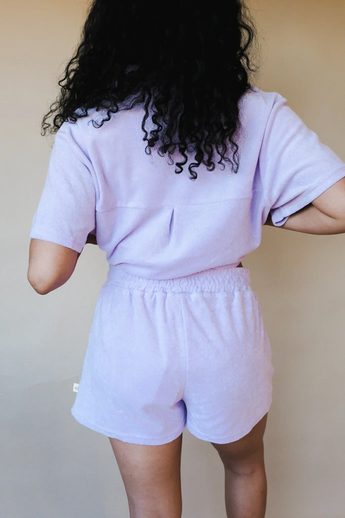 Araminta James Terry shirt set in orchid purple. These vintage inspired runner short feature a thick elastic waistband with pockets, and a matching boxy shirt.