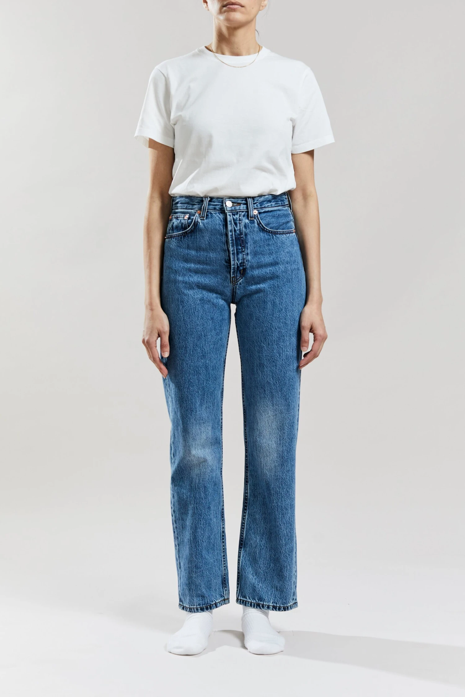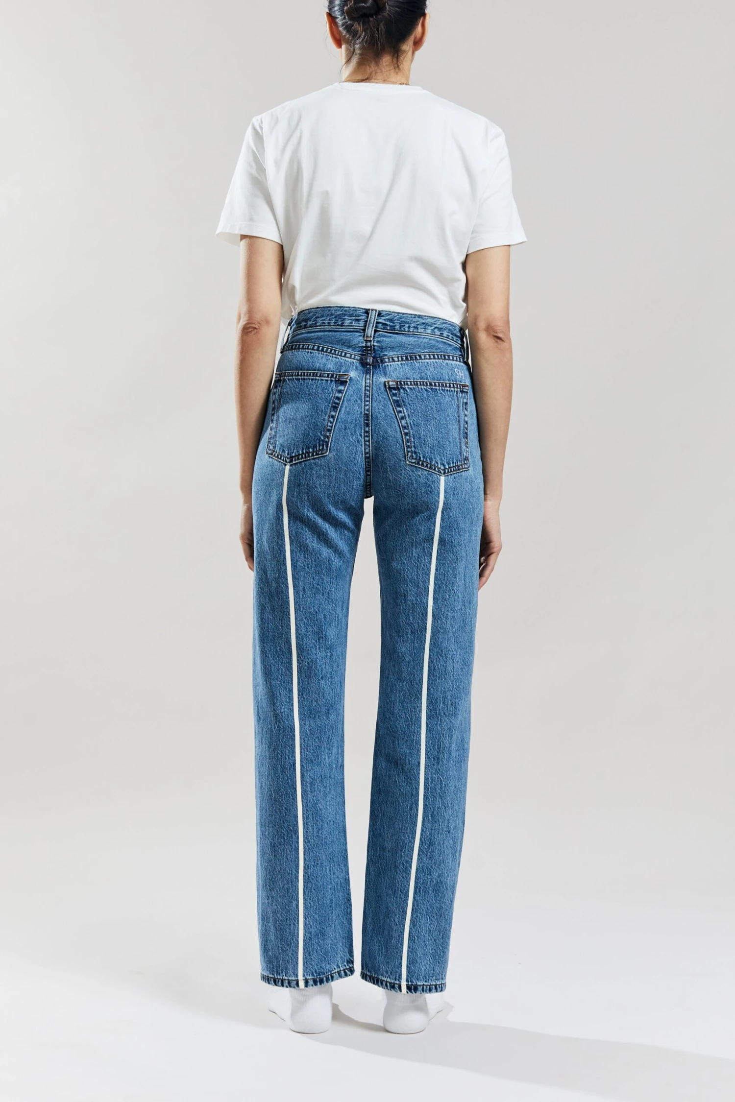 Still Here Childhood jeans in vintage blue wash with thin hand painted stripe. The Childhood is inspired by the “anti-fit” simplicity of your favorite childhood jeans. It’s a relaxed leg, super hi-rise, wedgie fit.