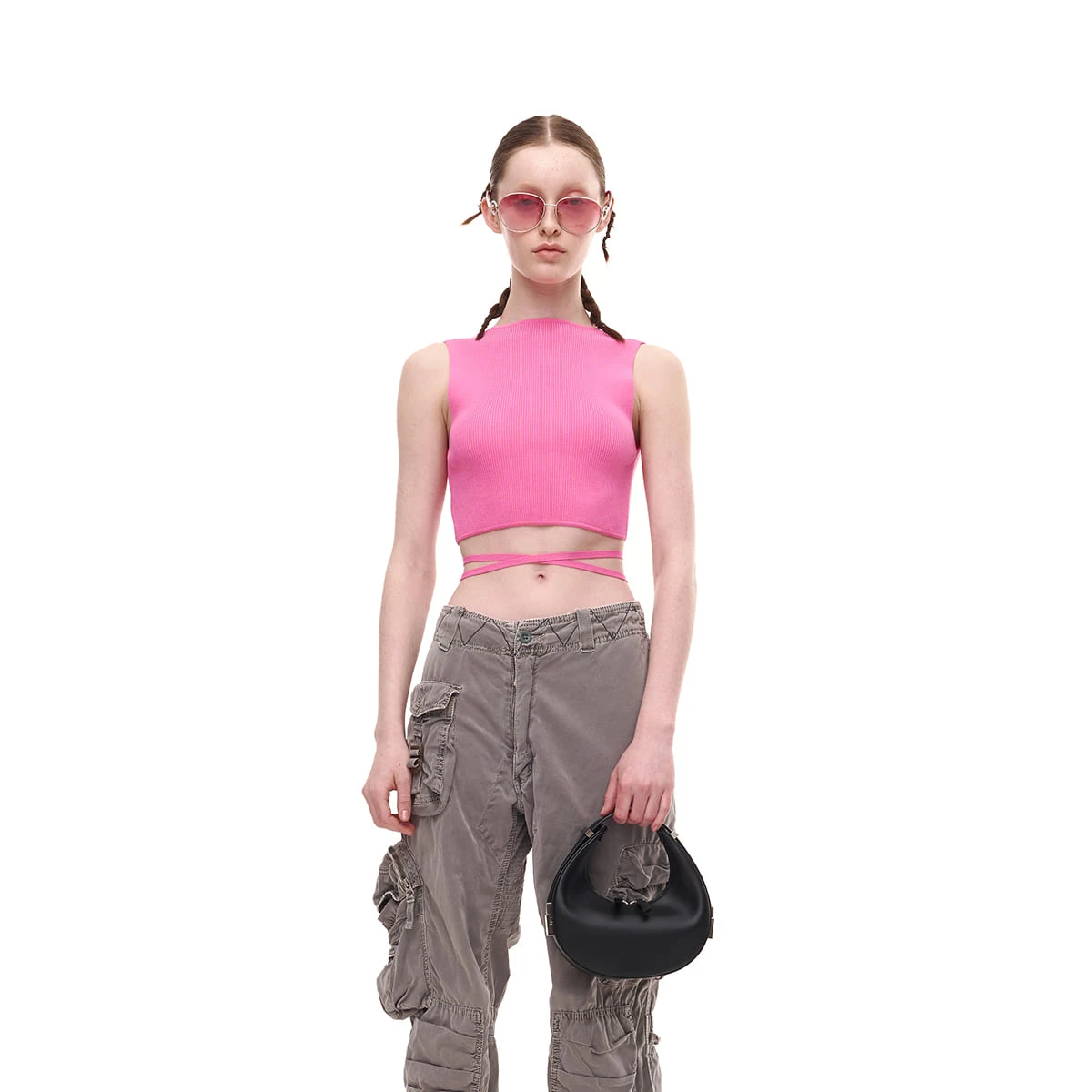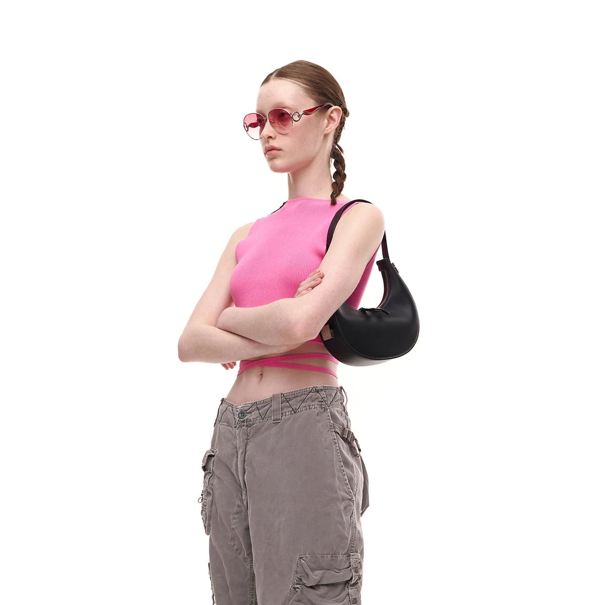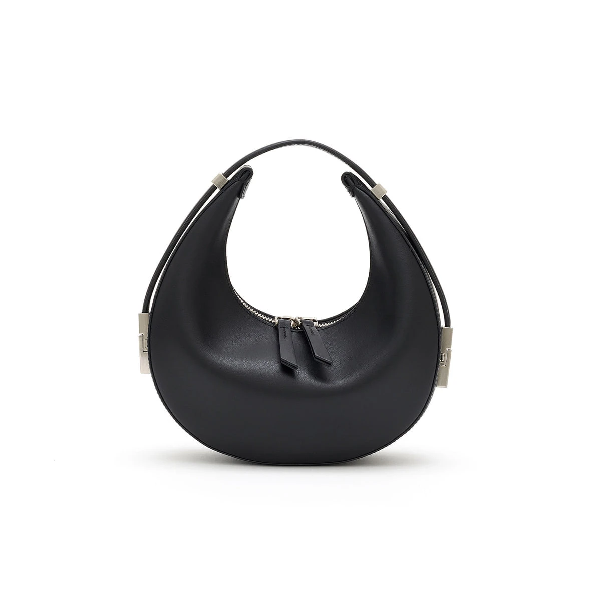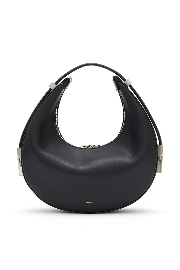 Osoi crescent shaped Toni mini bag in smooth black leather. Crafted from sleek black leather and has an angular teardrop shape with a distinctive adjustable strap. Zip closure.