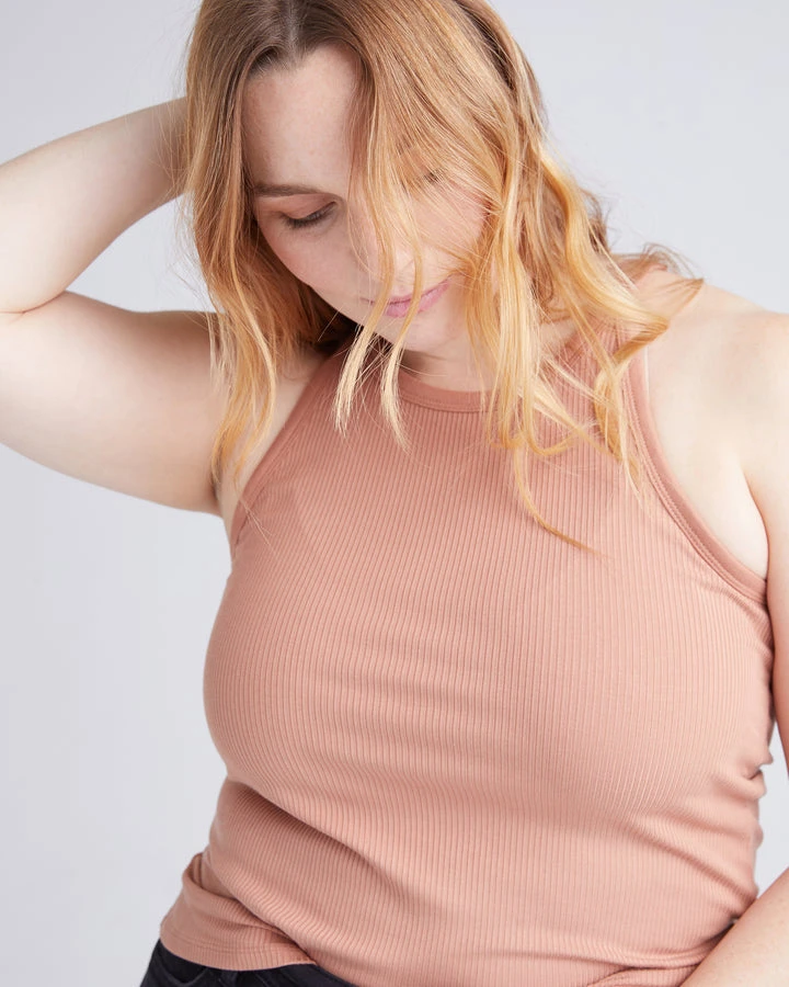 Richer Poorer vintage rib knit racer tank in mocha mousse. Slim fit, made from sustainable lyocell, high neckline with slight racer front shape.Â