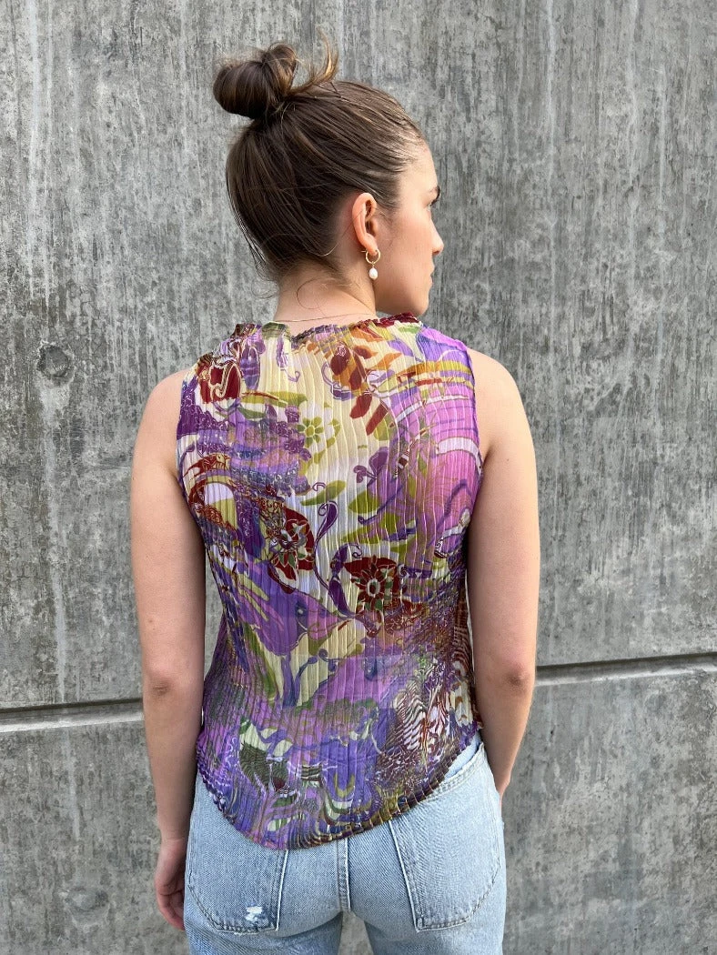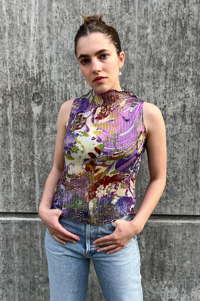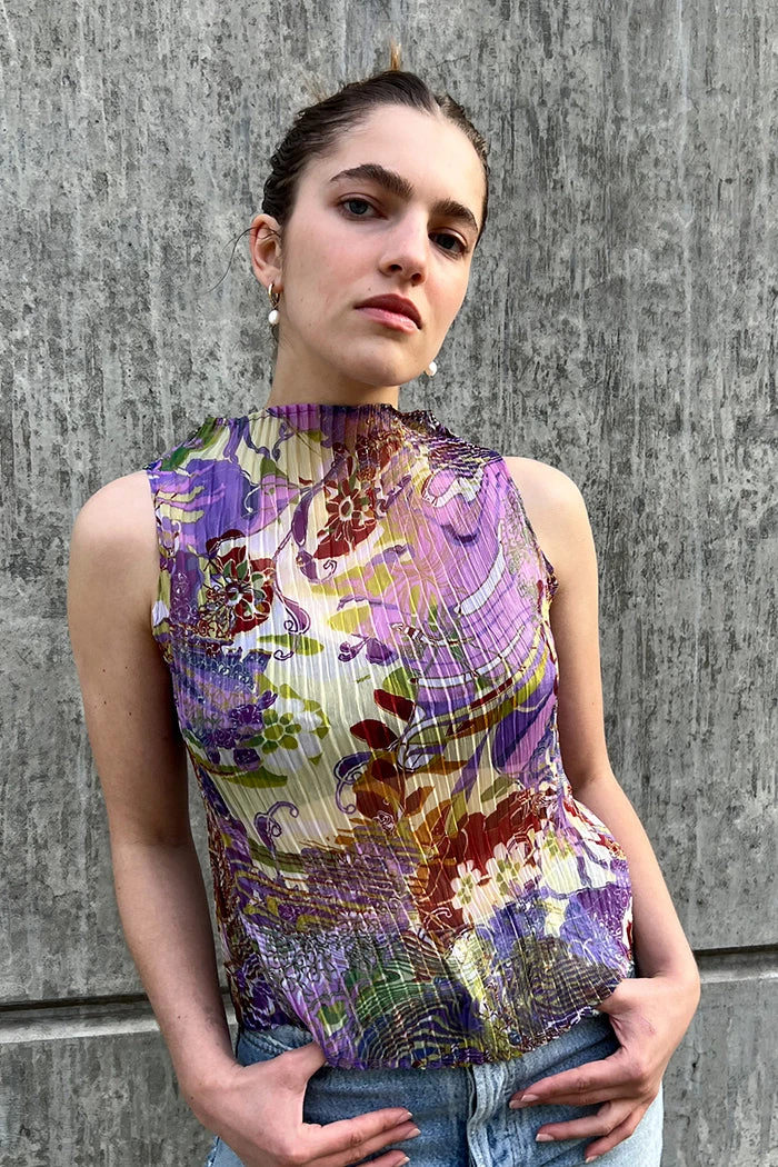 Nin Studios sheer wave mockneck tank in abundance purple print featuring a pleat style in a 1 cm wave design.