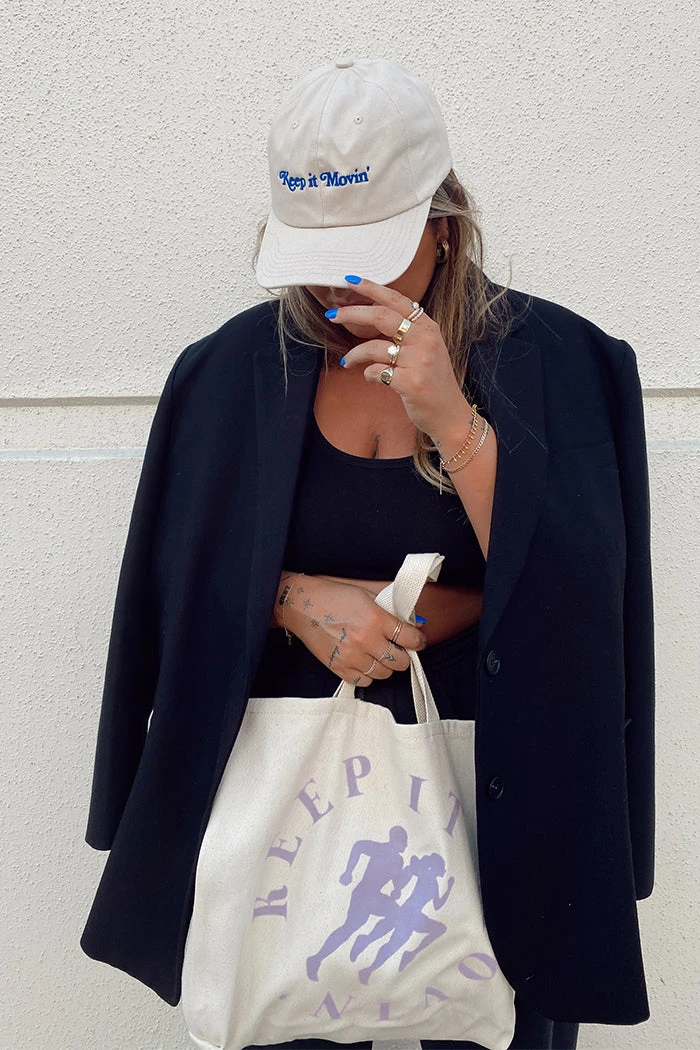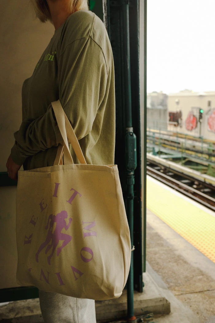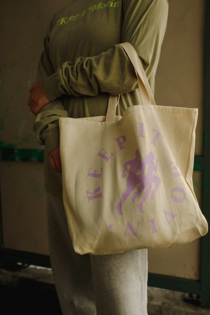 Keep it movin’ purple winners circle natural canvas tote.Â