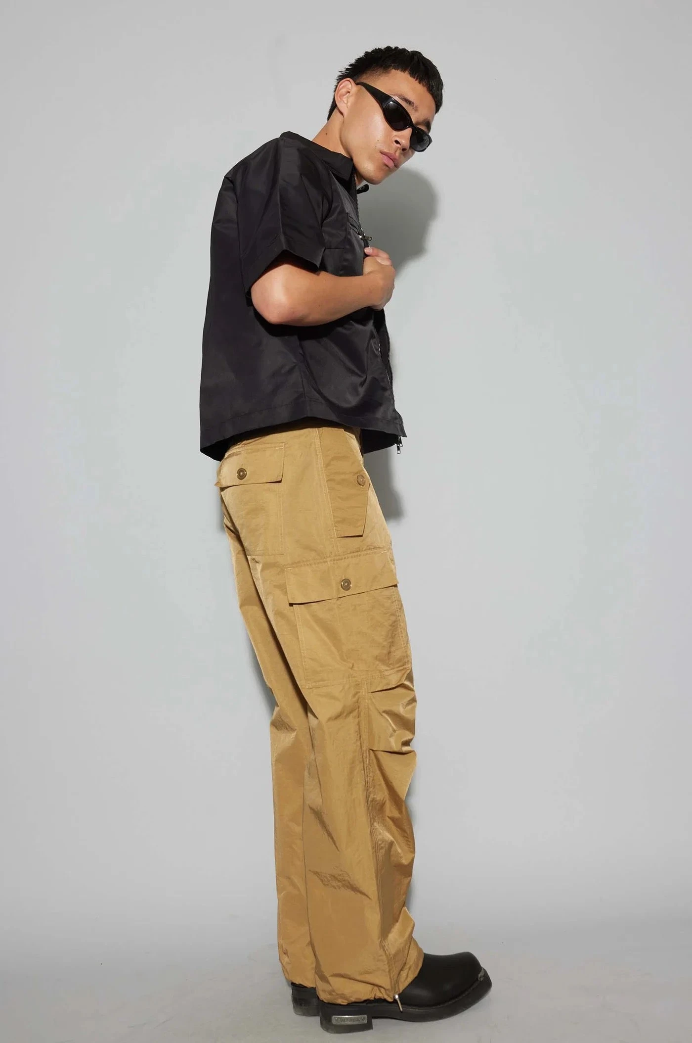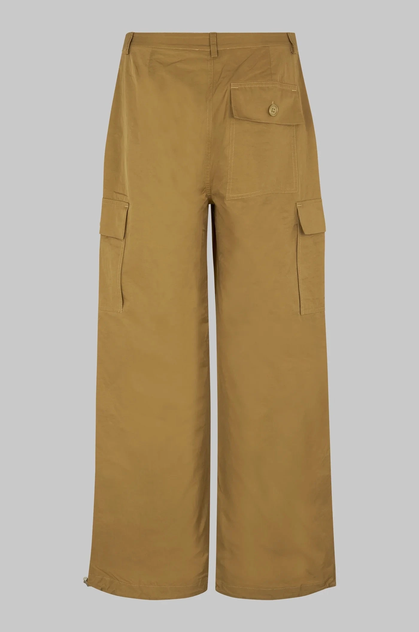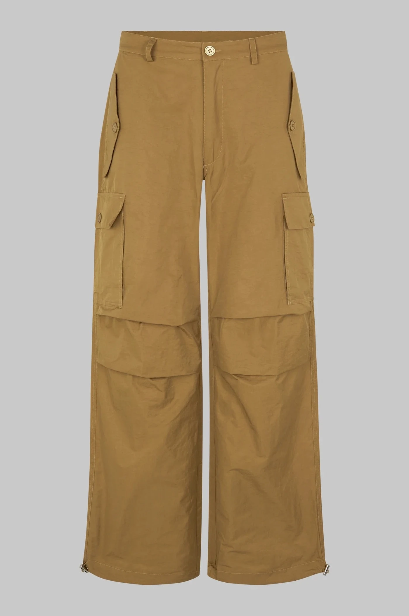 Oval Square cargo utility parachute work pant in kelp lightly lustrous finish. Featuring a concealed zip closure with button at the waistband. Two side pockets with buttoned flaps, two large cargo pockets at the thighs and single pocket with buttoned flap at the back. Darts at knees and drawstring with stopper at ankles. Regular waist with baggy leg that can be pulled at the ankle.