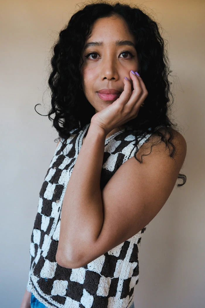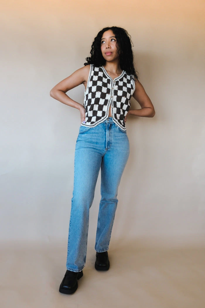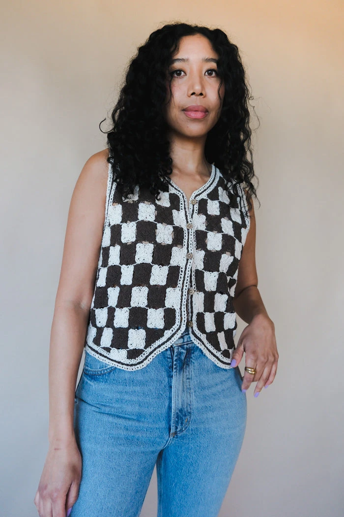 Brown and ecru checkered button up knit vest.